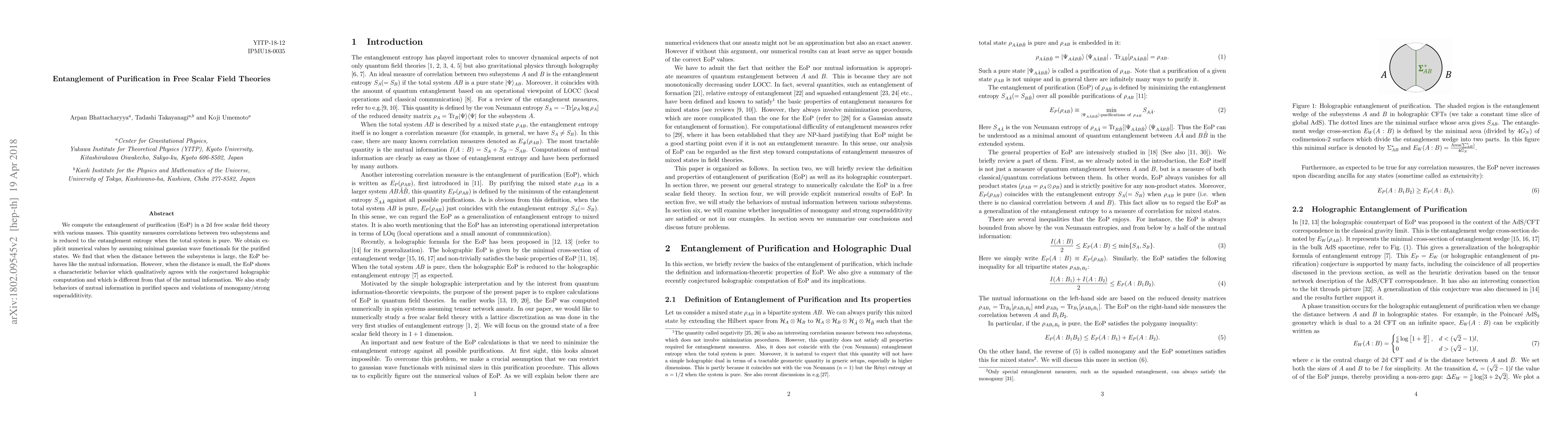 This paper computes the entanglement of purification in a 2d free scalar field theory, finding that it behaves like mutual information at large subsystem distances but shows distinct behavior at small distances. It also examines mutual information in purified states and discusses violations of monogamy/superadditivity.
