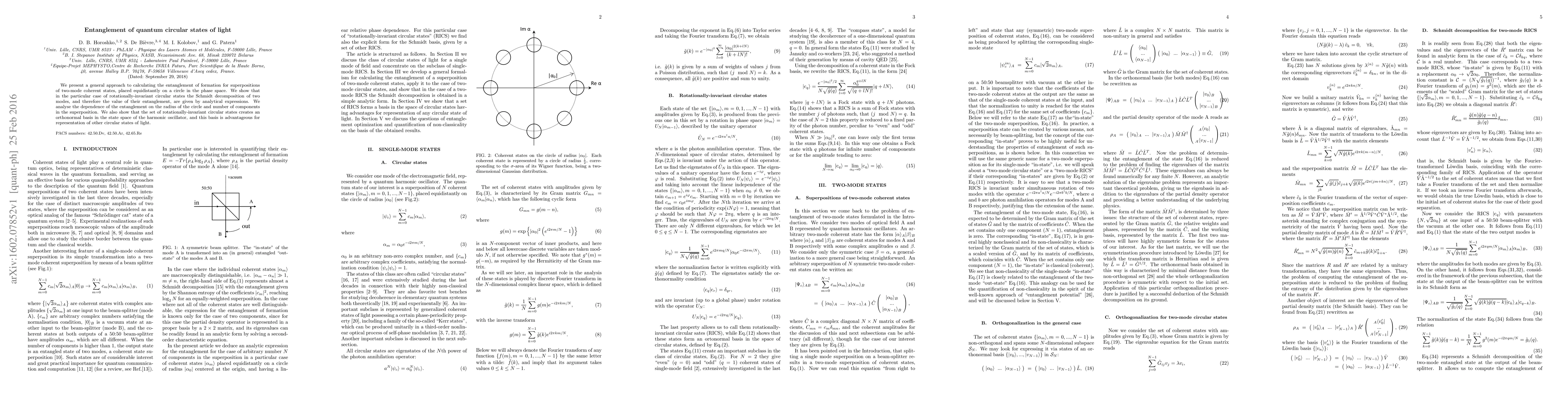 This paper develops a method to calculate the entanglement of quantum circular states of light, showing that rotationally-invariant circular states have analytical expressions for their entanglement. It analyzes how entanglement varies with the circle's radius and the number of superposition components, and demonstrates that these states form an orthonormal basis for the harmonic oscillator's state space.