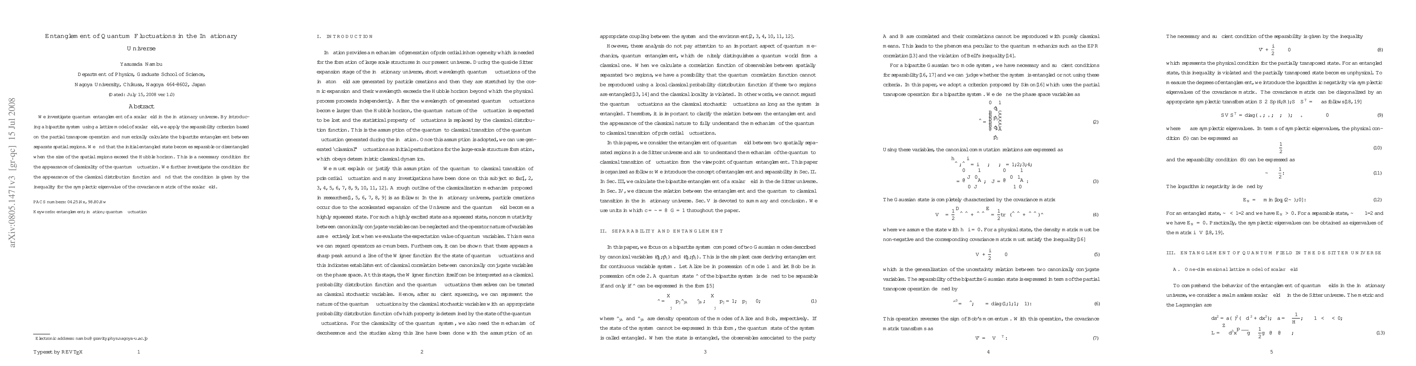 This paper explores quantum entanglement in scalar fields during the inflationary universe, revealing that entanglement becomes separable when spatial regions surpass the Hubble horizon, facilitating the emergence of classicality. The study also identifies a condition for the classical distribution function linked to the symplectic eigenvalue of the scalar field's covariance matrix.