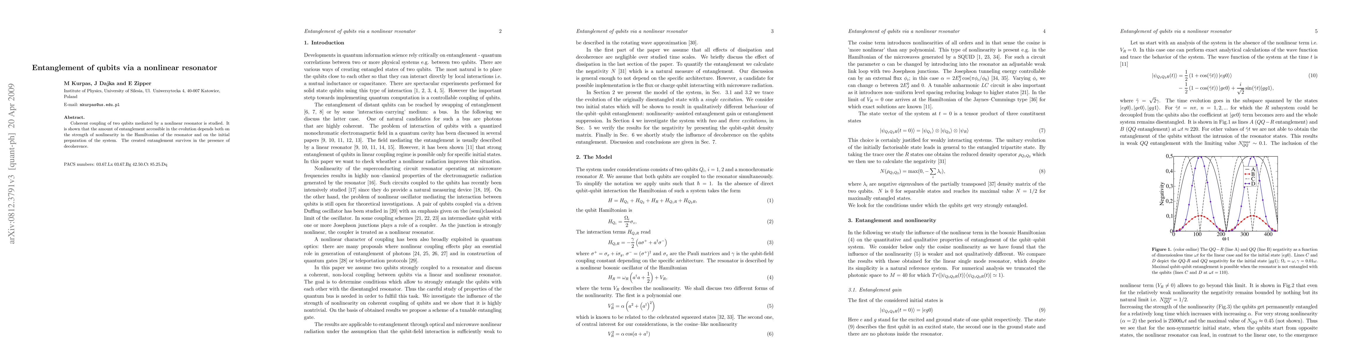 This paper investigates how entanglement between two qubits can be achieved through a nonlinear resonator, demonstrating that the degree of entanglement depends on the resonator's nonlinearity and initial system preparation, and that this entanglement persists despite decoherence.
