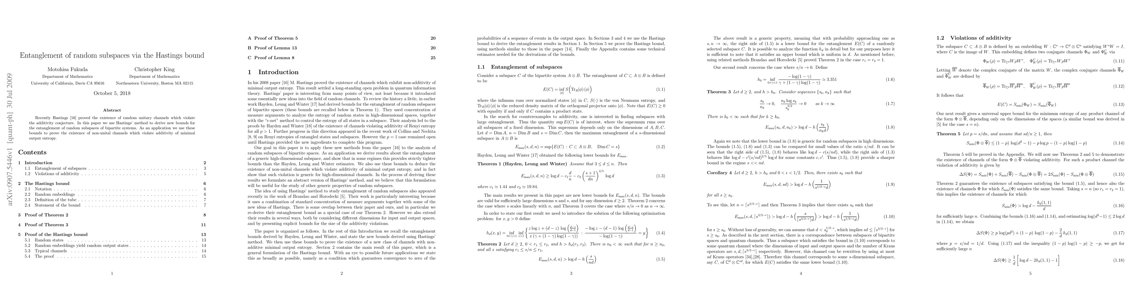 This paper employs Hastings' method to derive new bounds on the entanglement of random subspaces in bipartite quantum systems, demonstrating the existence of non-unital channels that violate the additivity conjecture for minimal output entropy.