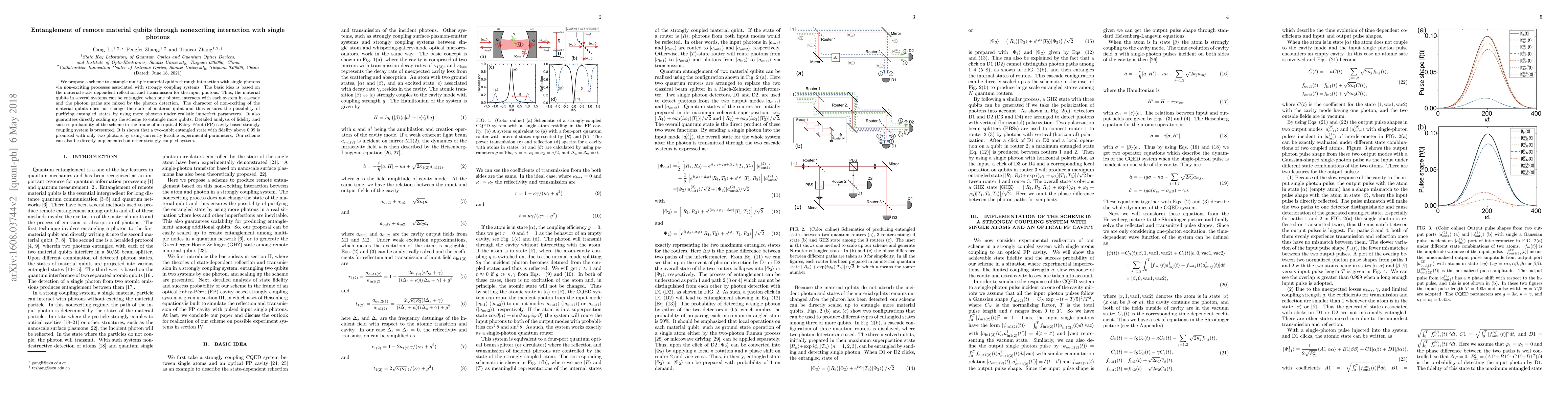 This paper proposes a method to entangle multiple material qubits via single photons through non-exciting interactions, ensuring fidelity above 0.99 with just two photons in a strongly coupled optical cavity system. The scheme allows for scalability and purification of entangled states despite imperfect parameters.