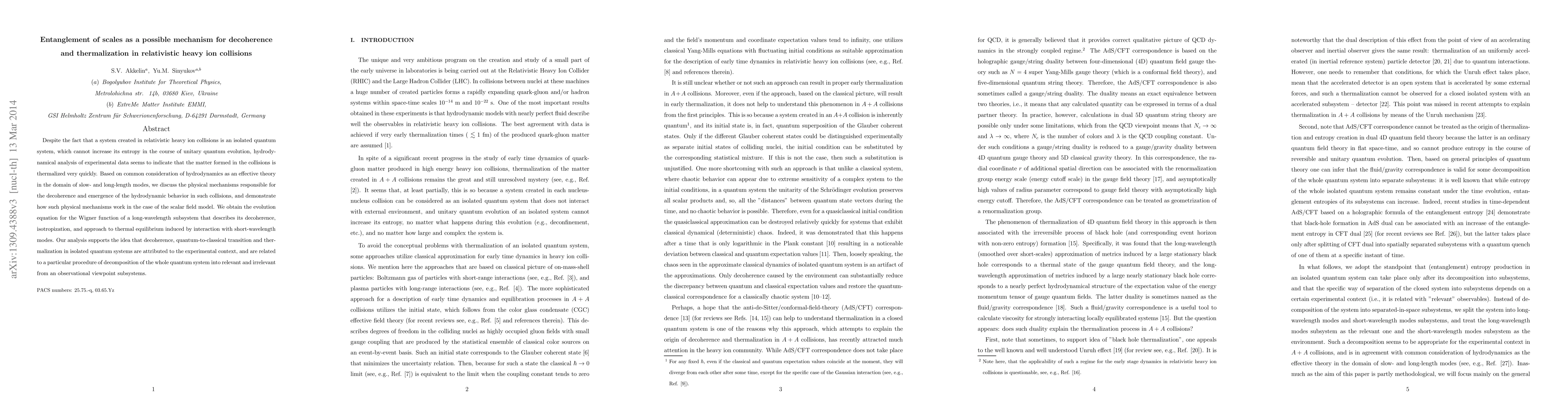 Despite the fact that a system created in relativistic heavy ion collisions is an isolated quantum system, which cannot increase its entropy in the course of unitary quantum evolution, hydrodynamical analysis of experimental data seems to indicate that the matter formed in the collisions is thermalized very quickly. Based on common consideration of hydrodynamics as an effective theory in the domain of slow- and long-length modes, we discuss the physical mechanisms responsible for the decoherence and emergence of the hydrodynamic behavior in such collisions, and demonstrate how such physical mechanisms work in the case of the scalar field model. We obtain the evolution equation for the Wigner function of a long-wavelength subsystem that describes its decoherence, isotropization, and approach to thermal equilibrium induced by interaction with short-wavelength modes. Our analysis supports the idea that decoherence, quantum-to-classical transition and thermalization in isolated quantum systems are attributed to the experimental context, and are related to a particular procedure of decomposition of the whole quantum system into relevant and irrelevant from an observational viewpoint subsystems.