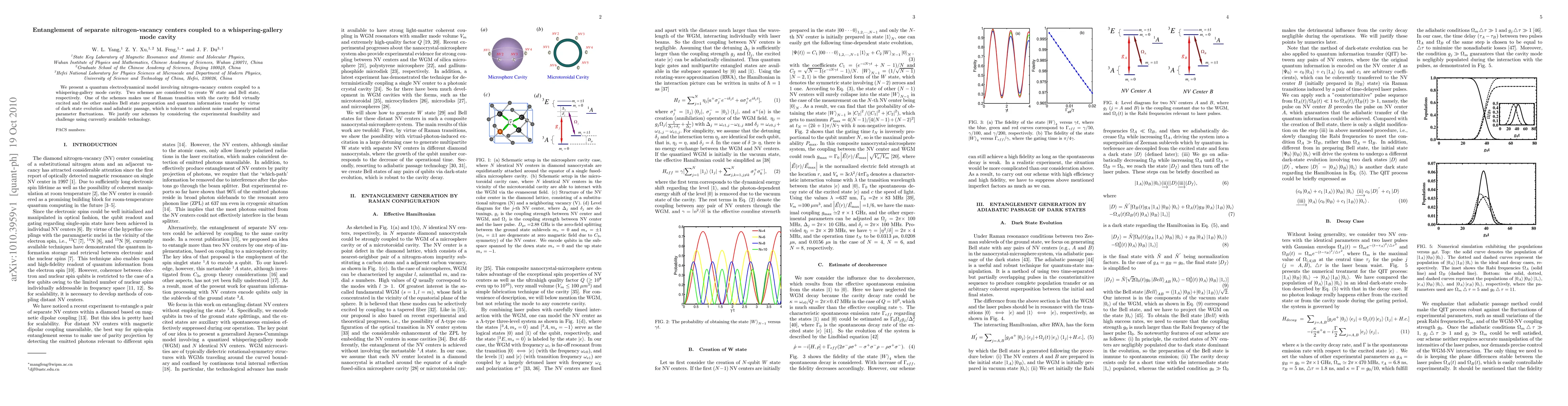 This paper proposes quantum electrodynamical models for creating W and Bell states using nitrogen-vacancy centers in a whispering-gallery mode cavity. It explores two schemes: one utilizing Raman transitions and the other employing dark state evolution and adiabatic passage for noise-tolerant quantum information transfer.