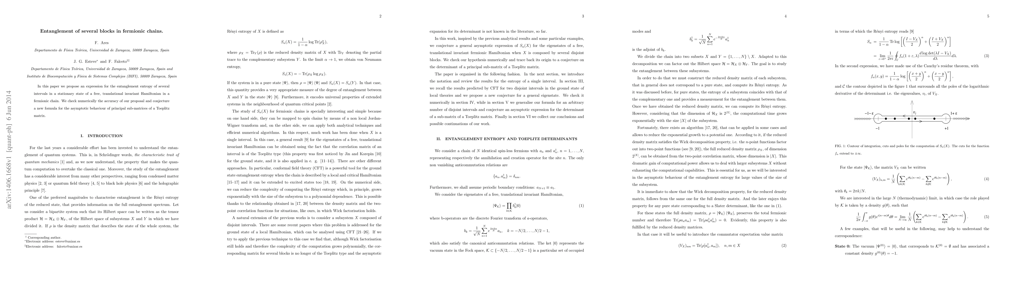 In this paper we propose an expression for the entanglement entropy of several intervals in a stationary state of a free, translational invariant Hamiltonian in a fermionic chain. We check numerically the accuracy of our proposal and conjecture a new formula for the asymptotic behaviour of principal sub-matrices of a Toeplitz matrix.