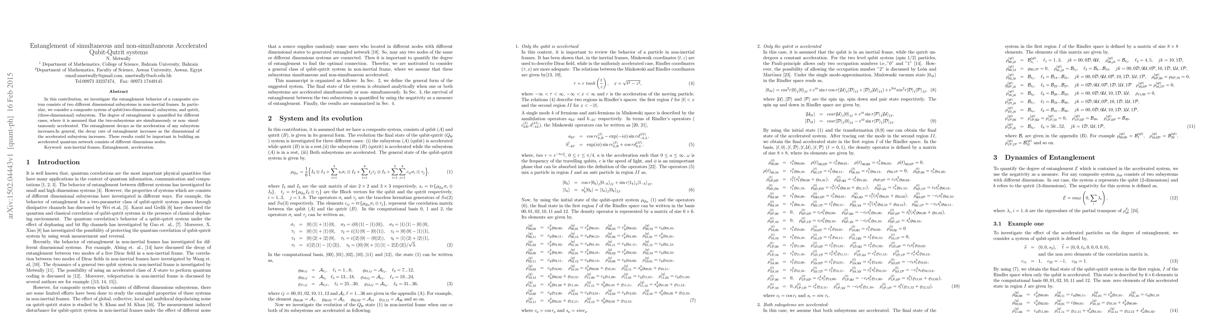 In this contribution, we investigate the entanglement behavior of a composite system consists of two different dimensional subsystems in non-inertial frames. In particular, we consider a composite system of qubit(two-dimensional) subsystem, and qutrit, (three-dimensional) subsystem. The degree of entanglement is quantified for different cases, where it is assumed that the two-subsystems are simultaneously or non- simultaneously accelerated. The entanglement decays as the acceleration of any subsystem increases.In general, the decay rate of entanglement increases as the dimensional of the accelerated subsystem increases. These results could be important in building an accelerated quantum network consists of different dimensions nodes.