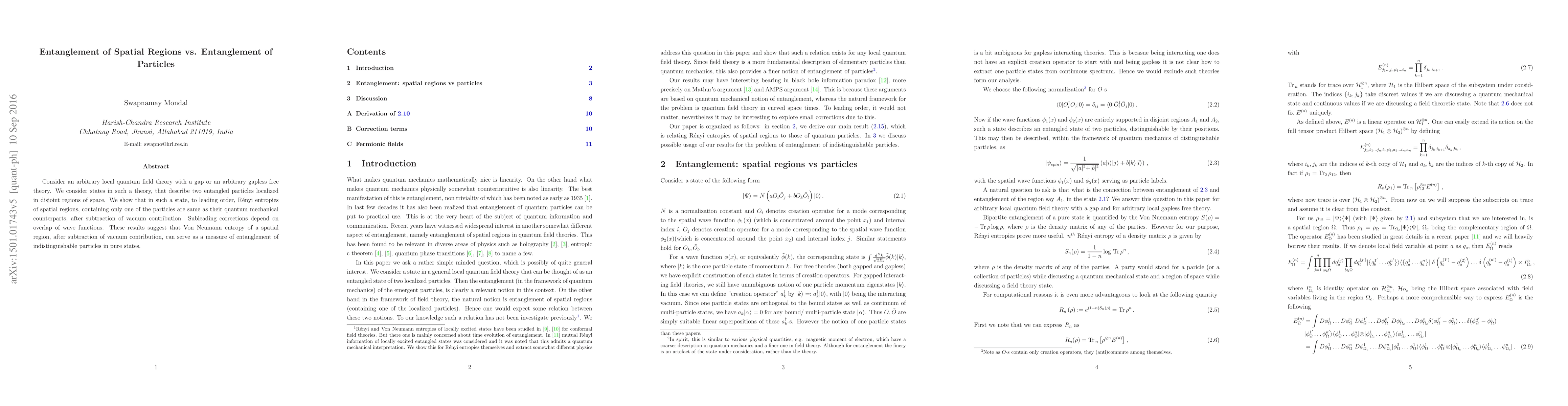 Consider an arbitrary local quantum field theory with a gap or an arbitrary gapless free theory. We consider states in such a theory, that describe two entangled particles localized in disjoint regions of space. We show that in such a state, to leading order, R\'{e}nyi entropies of spatial regions, containing only one of the particles are same as their quantum mechanical counterparts, after subtraction of vacuum contribution. Subleading corrections depend on overlap of wave functions. These results suggest that Von Neumann entropy of a spatial region, after subtraction of vacuum contribution, can serve as a measure of entanglement of indistinguishable particles in pure states.