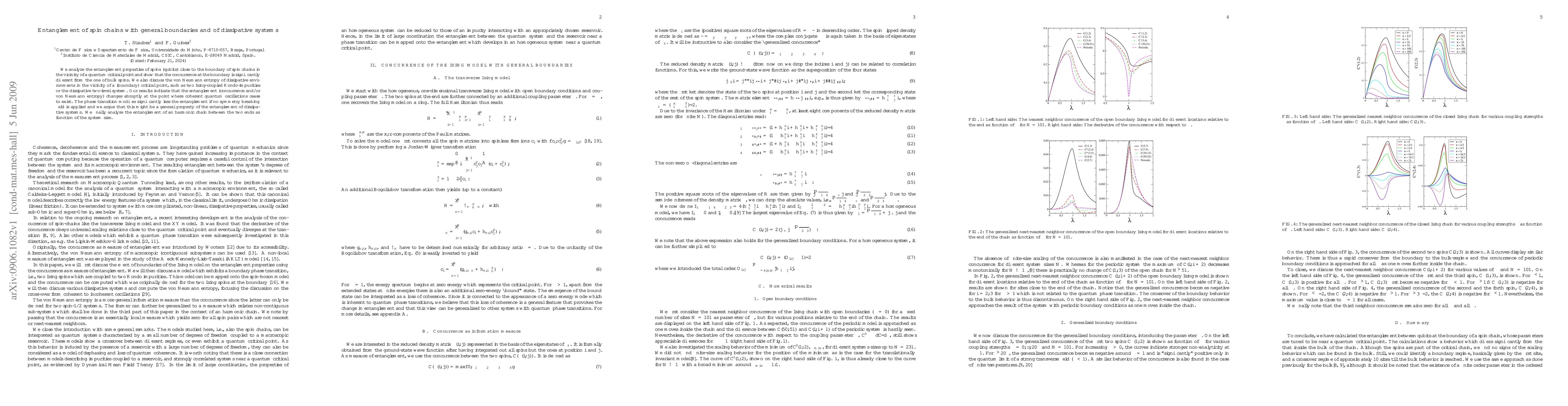 Researchers studied how entanglement behaves in spins near boundaries of quantum systems, finding that it changes abruptly at the point where coherent oscillations cease to exist. This behavior may be a general property of dissipative systems, regardless of symmetry-breaking fields.