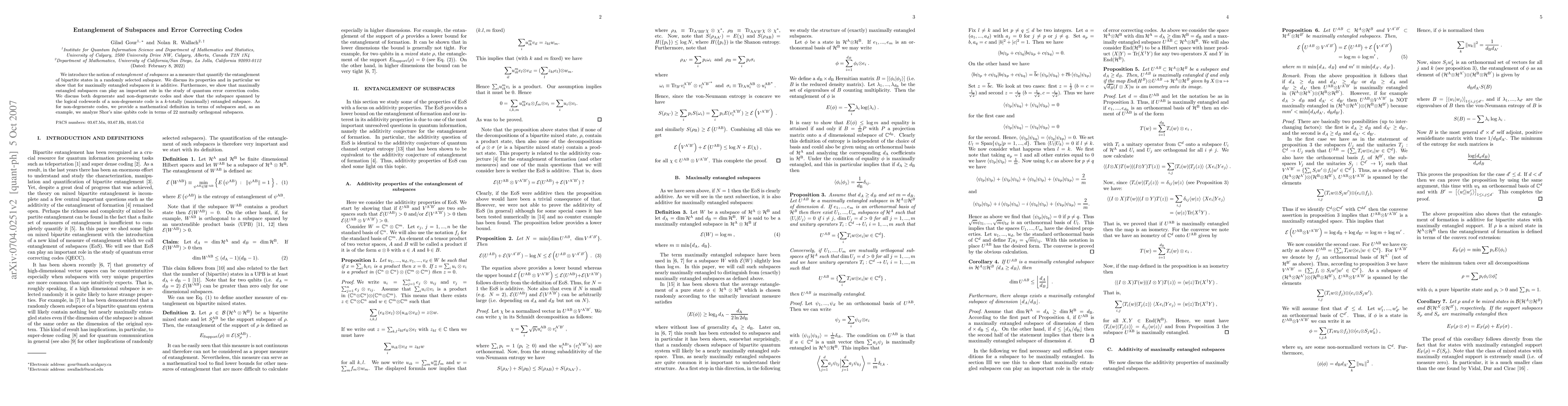 This paper introduces the concept of entanglement of subspaces to quantify entanglement in bipartite states within randomly selected subspaces, demonstrating its additivity for maximally entangled subspaces. It also explores the role of these subspaces in quantum error correction codes, showing that the subspace of logical codewords in non-degenerate codes is maximally entangled, with Shor's nine-qubit code analyzed as an example.