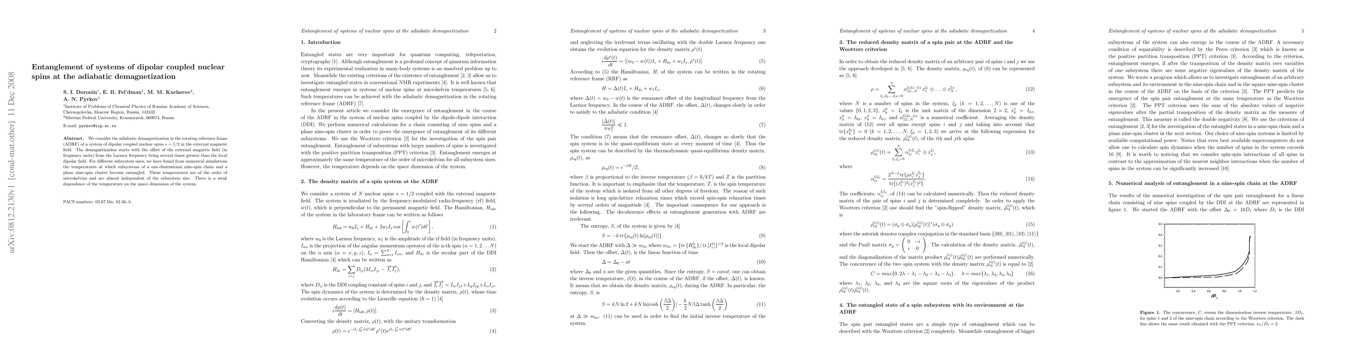 This paper investigates the entanglement of dipolar coupled nuclear spins during adiabatic demagnetization in a rotating reference frame. Numerical simulations reveal that subsystems of a one-dimensional nine-spin chain and a plane nine-spin cluster become entangled at microkelvin temperatures, which are nearly independent of the subsystem size but weakly dependent on the system's spatial dimension.