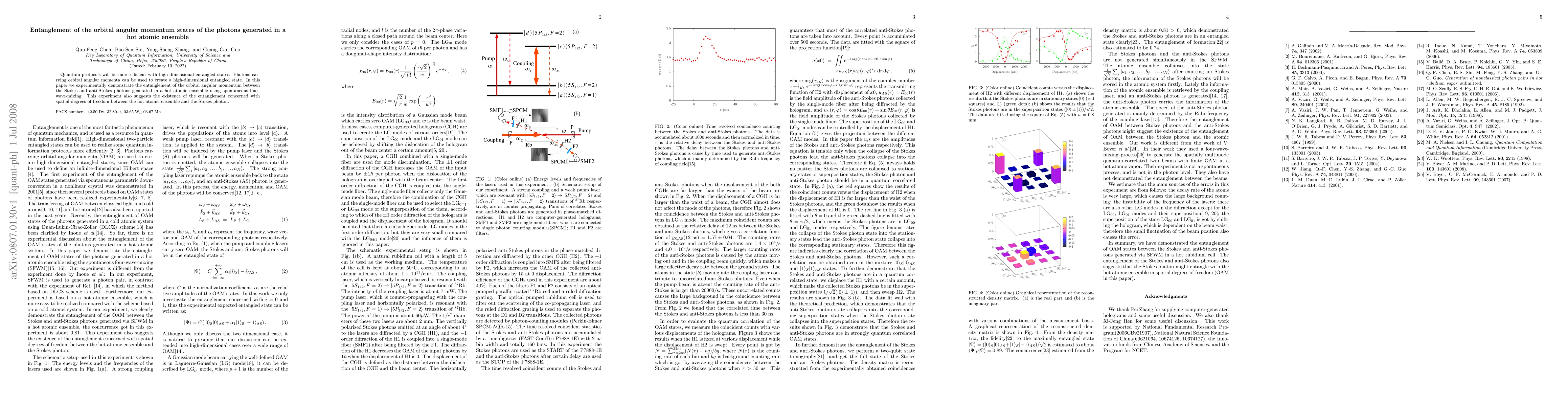 This paper demonstrates the entanglement of orbital angular momentum states between Stokes and anti-Stokes photons generated in a hot atomic ensemble via spontaneous four-wave-mixing, highlighting potential for high-dimensional quantum protocols. The experiment also implies the existence of entanglement between the atomic ensemble and the Stokes photon concerning spatial degrees of freedom.