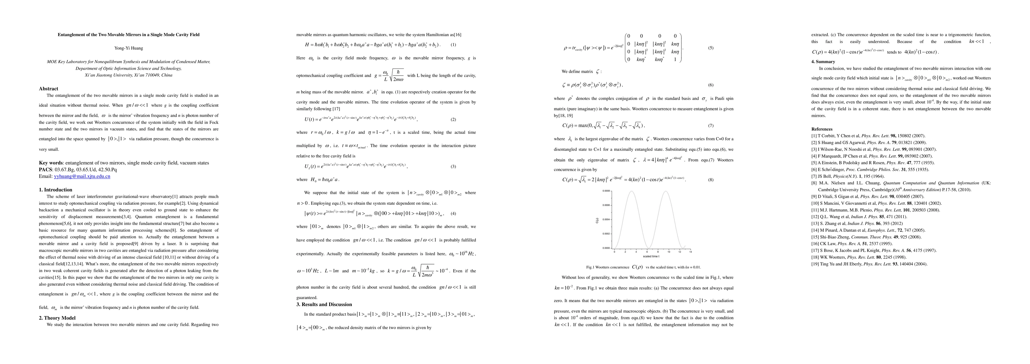 Two-line summary: This research investigates the entanglement of two movable mirrors within a single mode cavity field in an ideal, noise-free environment. It finds that the mirrors become entangled through radiation pressure when the coupling coefficient is much smaller than the mirror vibration frequency, albeit with minimal Wootters concurrence.