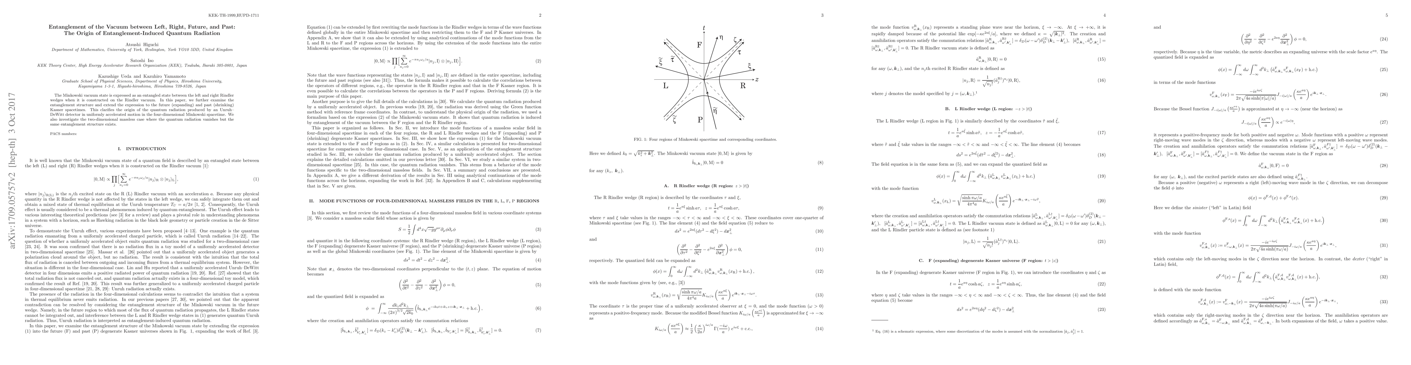 The Minkowski vacuum state is expressed as an entangled state between the left and right Rindler wedges when it is constructed on the Rindler vacuum. In this paper, we further examine the entanglement structure and extend the expression to the future (expanding) and past (shrinking) Kasner spacetimes. This clarifies the origin of the quantum radiation produced by an Unruh--DeWitt detector in uniformly accelerated motion in the four-dimensional Minkowski spacetime. We also investigate the two-dimensional massless case where the quantum radiation vanishes but the same entanglement structure exists.