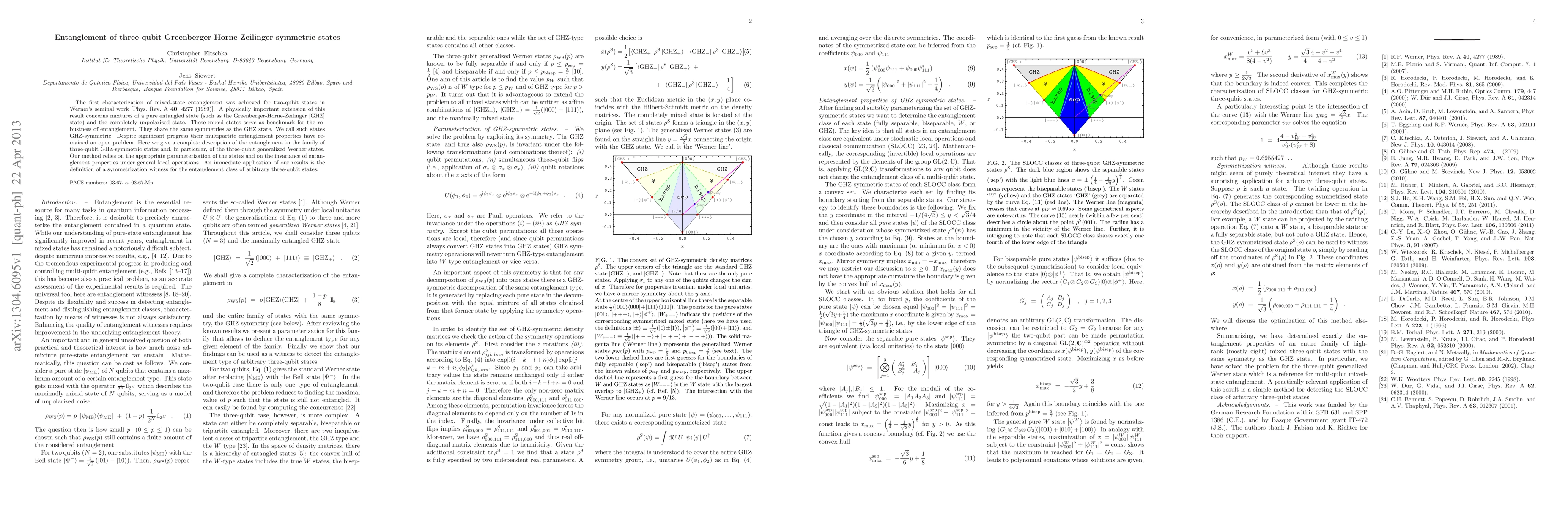 This paper characterizes the entanglement properties of three-qubit Greenberger-Horne-Zeilinger (GHZ)-symmetric states, including generalized Werner states, providing a complete description of their entanglement. The study introduces a symmetrization witness for assessing entanglement in any three-qubit state.