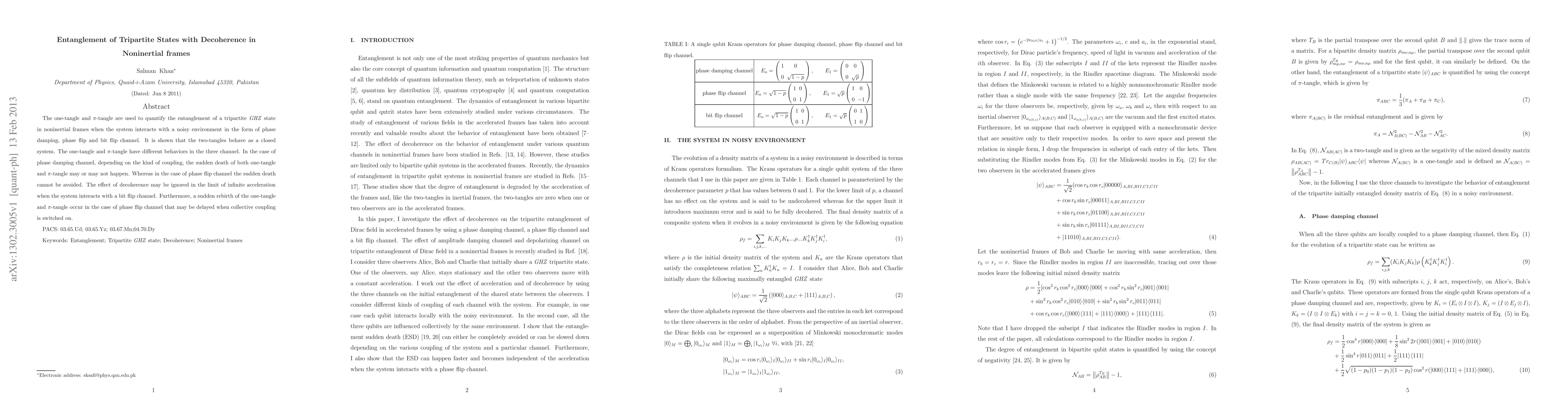This paper investigates the entanglement of a tripartite GHZ state in noninertial frames under various decoherence channels, showing distinct behaviors of one-tangle and π-tangle. It finds that while phase damping can lead to sudden death of entanglement, phase flip channel induces unavoidable sudden death and potential rebirth, with decoherence effects diminishing at infinite acceleration.