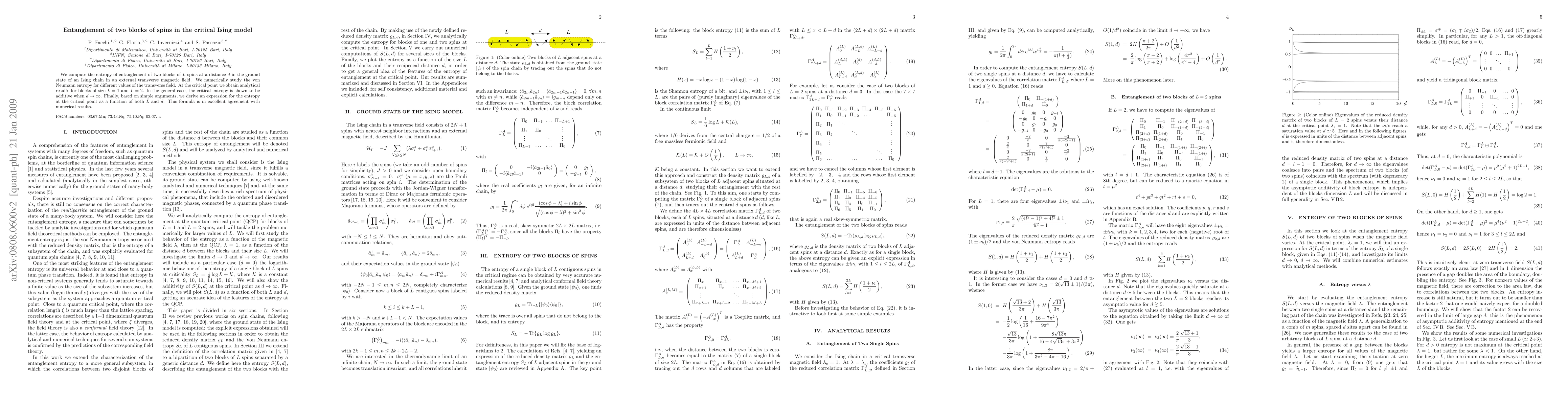 This paper investigates the entanglement entropy of two spin blocks in the critical Ising model, finding that the critical entropy is additive for large distances. Analytical results at the critical point for small blocks are derived, and a formula for the entropy as a function of block size and distance matches numerical findings.