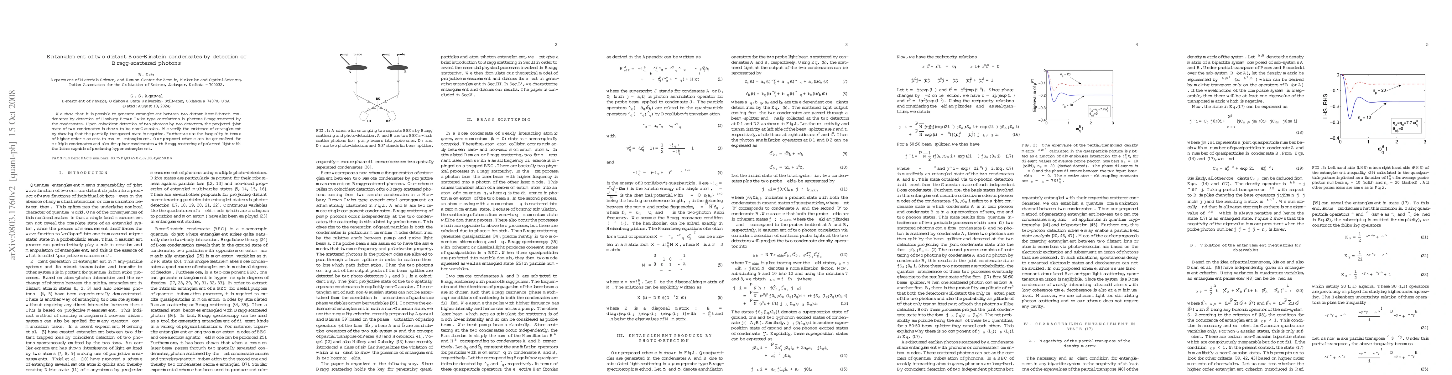 This research demonstrates entanglement between two distant Bose-Einstein condensates using detection of Bragg-scattered photons, confirming non-Gaussian joint states via Hanbury Brown-Twiss correlations and negativity in the partially transposed state, with potential for extension to multiple and spinor condensates.