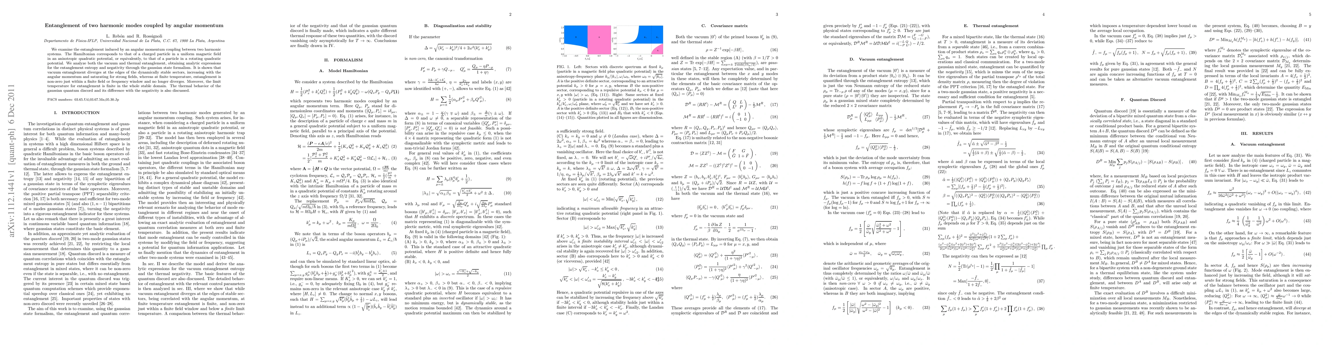 This paper investigates entanglement in two harmonic modes linked by angular momentum, revealing that vacuum entanglement diverges at the boundaries of stable sectors and saturates under strong fields. At finite temperatures, entanglement exists within a limited field or frequency range without divergence, and the maximum temperature for entanglement remains finite across the stable domain.