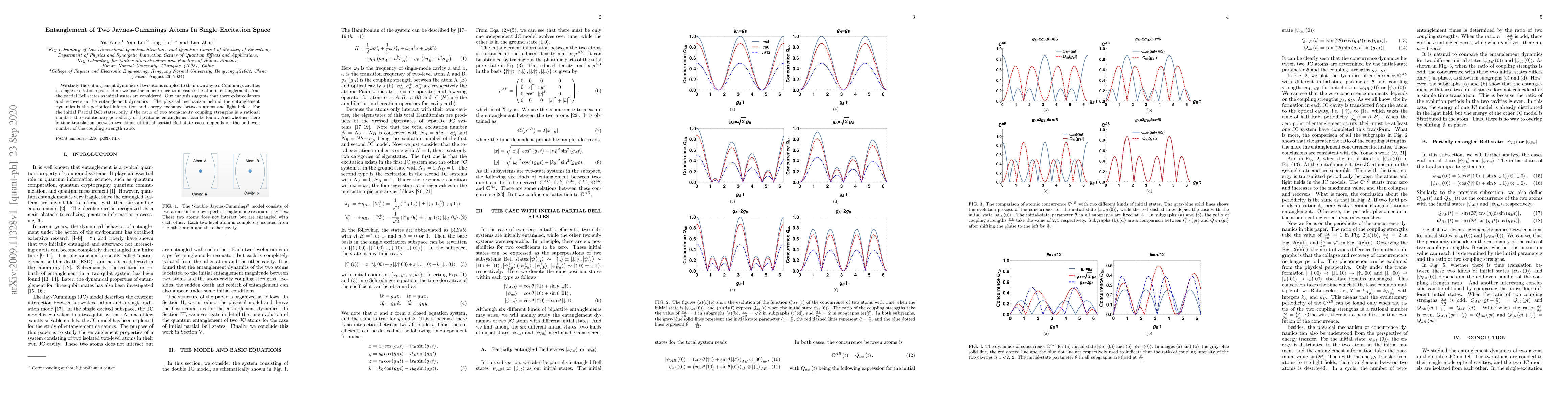 We study the entanglement dynamics of two atoms coupled to their own Jaynes-Cummings cavities in single-excitation space. Here we use the concurrence to measure the atomic entanglement. And the partial Bell states as initial states are considered. Our analysis suggests that there exist collapses and recovers in the entanglement dynamics. The physical mechanism behind the entanglement dynamics is the periodical information and energy exchange between atoms and light fields. For the initial Partial Bell states, only if the ratio of two atom-cavity coupling strengths is a rational number, the evolutionary periodicity of the atomic entanglement can be found. And whether there is time translation between two kinds of initial partial Bell state cases depends on the odd-even number of the coupling strength ratio.