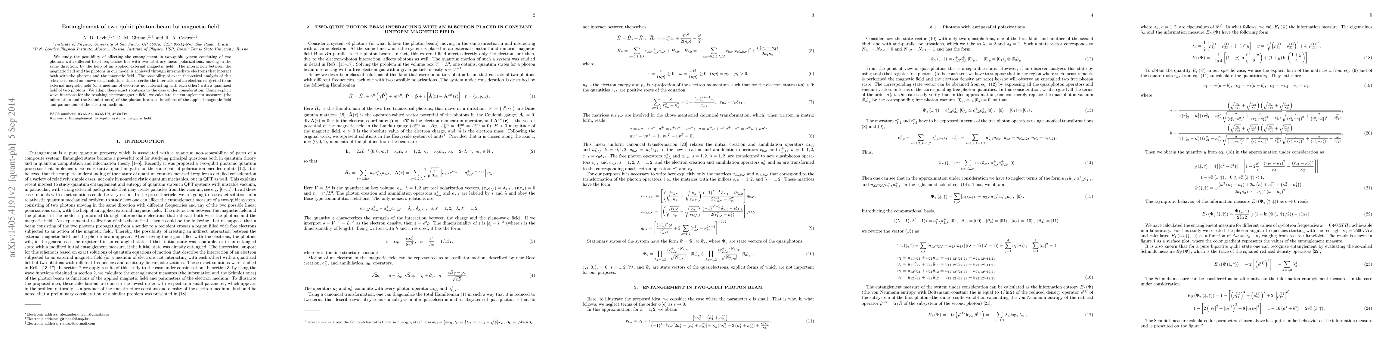 We have studied the possibility of affecting the entanglement measure of 2-qubit system consisting of two photons with different fixed frequencies but with two arbitrary linear polarizations, moving in the same direction, by the help of an applied external magnetic field. The interaction between the magnetic field and the photons in our model is achieved through intermediate electrons that interact with both the photons and the magnetic field. The possibility of exact theoretical analysis of this scheme is based on known exact solutions that describe the interaction of an electron subjected to an external magnetic field (or a medium of electrons not interacting with each other) with a quantized field of two photons. We adapt these exact solutions to the case under consideration. Using explicit wave functions for the resulting electromagnetic field, we calculate the entanglement measure of the photon beam as a function of the applied magnetic field and parameters of the electron medium.