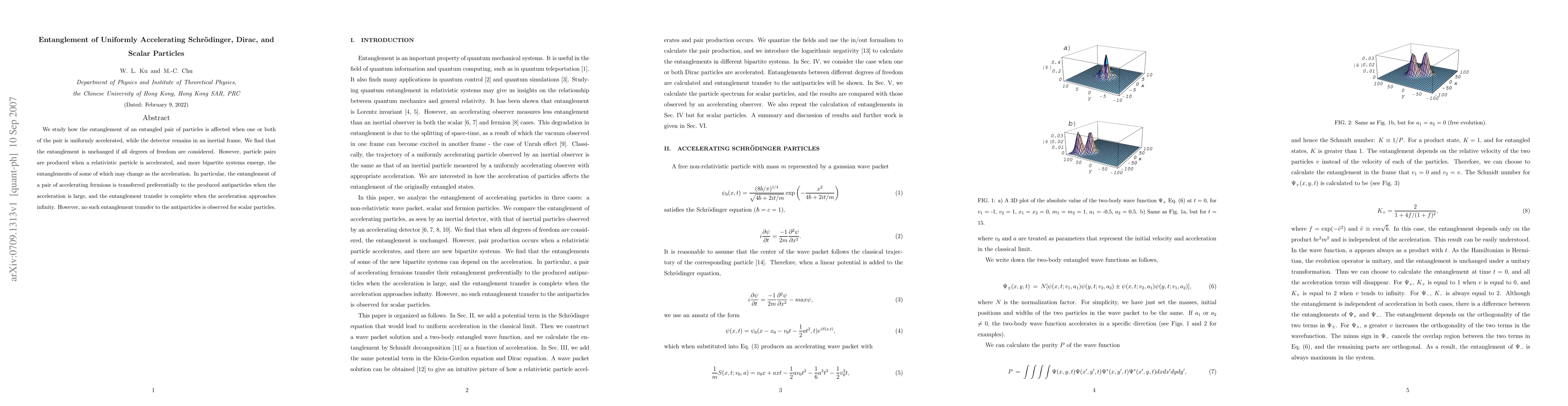 We study how the entanglement of an entangled pair of particles is affected when one or both of the pair is uniformly accelerated, while the detector remains in an inertial frame. We find that the entanglement is unchanged if all degrees of freedom are considered. However, particle pairs are produced when a relativistic particle is accelerated, and more bipartite systems emerge, the entanglements of some of which may change as the acceleration. In particular, the entanglement of a pair of accelerating fermions is transferred preferentially to the produced antiparticles when the acceleration is large, and the entanglement transfer is complete when the acceleration approaches infinity. However, no such entanglement transfer to the antiparticles is observed for scalar particles.