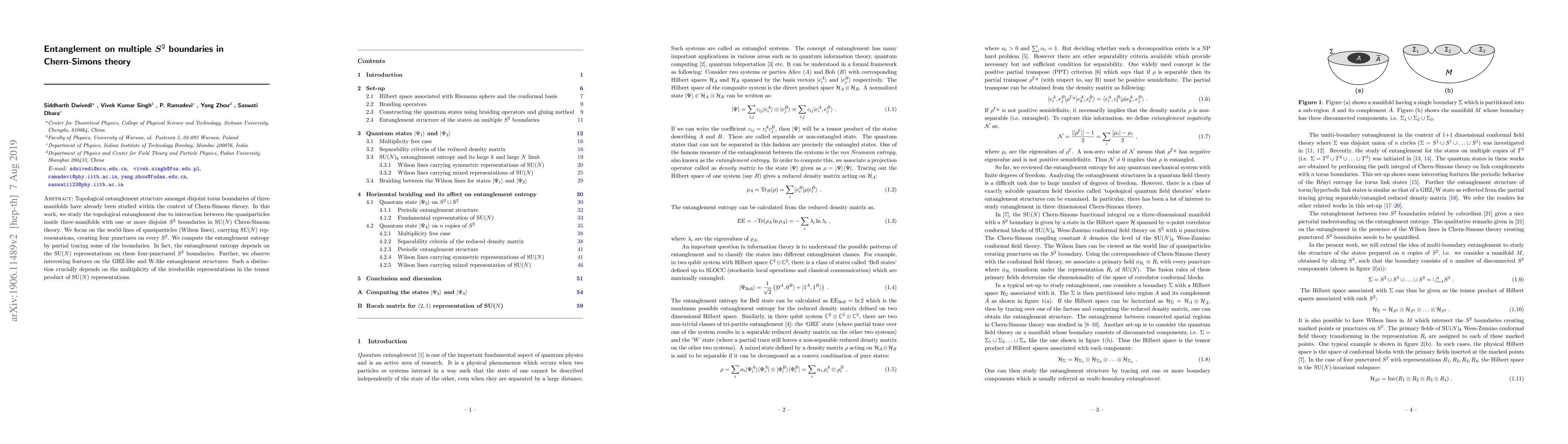 This paper investigates the topological entanglement in SU($N$) Chern-Simons theory on multiple $S^2$ boundaries, focusing on quasiparticles' interactions. It computes entanglement entropy based on SU($N$) representations on four-punctured $S^2$ boundaries, revealing GHZ-like and W-like entanglement structures dependent on representation multiplicities.