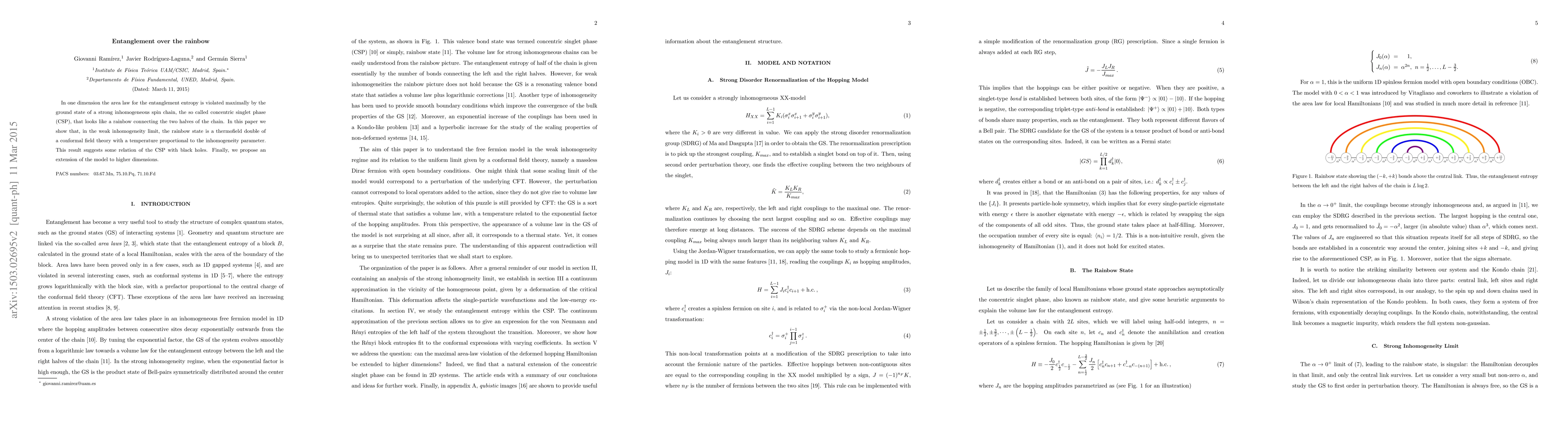 In one dimension the area law for the entanglement entropy is violated maximally by the ground state of a strong inhomogeneous spin chain, the so called concentric singlet phase (CSP), that looks like a rainbow connecting the two halves of the chain. In this paper we show that, in the weak inhomogeneity limit, the rainbow state is a thermofield double of a conformal field theory with a temperature proportional to the inhomogeneity parameter. This result suggests some relation of the CSP with black holes. Finally, we propose an extension of the model to higher dimensions.
