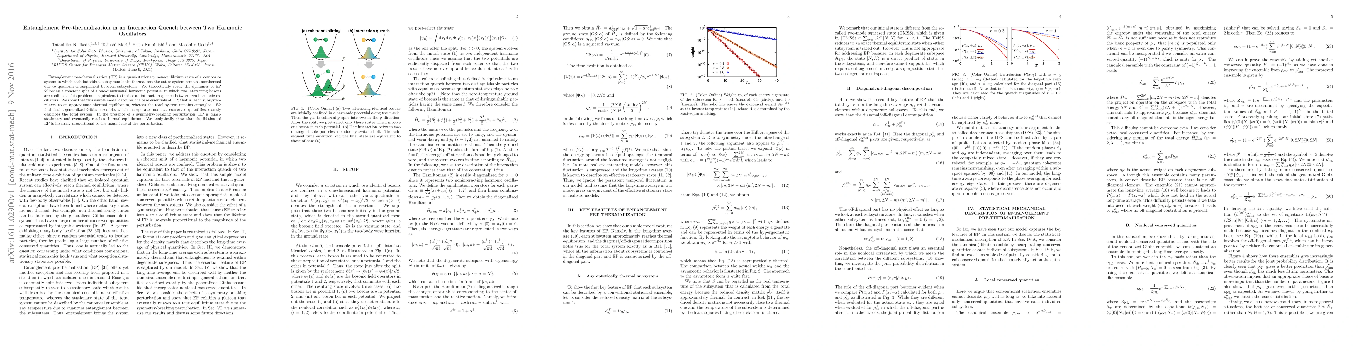 Entanglement pre-thermalization (EP) is a quasi-stationary nonequilibrium state of a composite system in which each individual subsystem looks thermal but the entire system remains nonthermal due to quantum entanglement between subsystems. We theoretically study the dynamics of EP following a coherent split of a one-dimensional harmonic potential in which two interacting bosons are confined. This problem is equivalent to that of an interaction quench between two harmonic oscillators. We show that this simple model captures the bare essentials of EP; that is, each subsystem relaxes to an approximate thermal equilibrium, whereas the total system remains entangled. We find that a generalized Gibbs ensemble, which incorporates nonlocal conserved quantities, exactly describes the total system. In the presence of a symmetry-breaking perturbation, EP is quasi-stationary and eventually reaches thermal equilibrium. We analytically show that the lifetime of EP is inversely proportional to the magnitude of the perturbation.