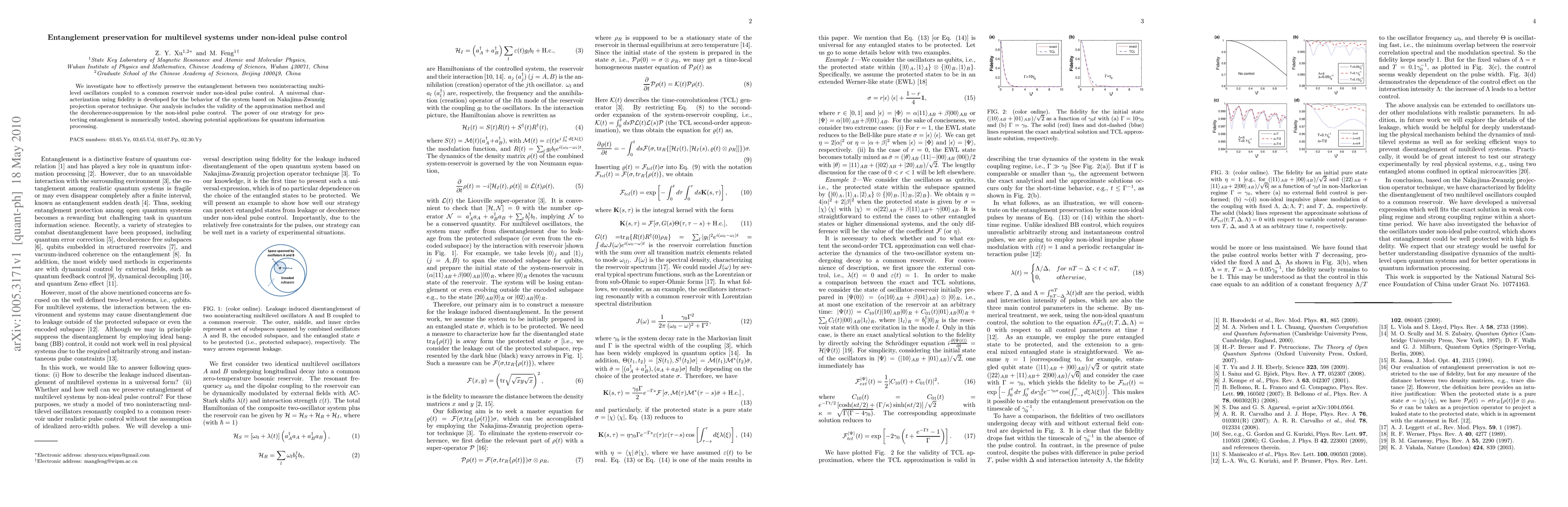 This paper explores methods to maintain entanglement in multilevel oscillators under non-ideal pulse control, using fidelity and the Nakajima-Zwanzig projection operator technique. The study evaluates the effectiveness of these methods and their potential for quantum information processing applications.