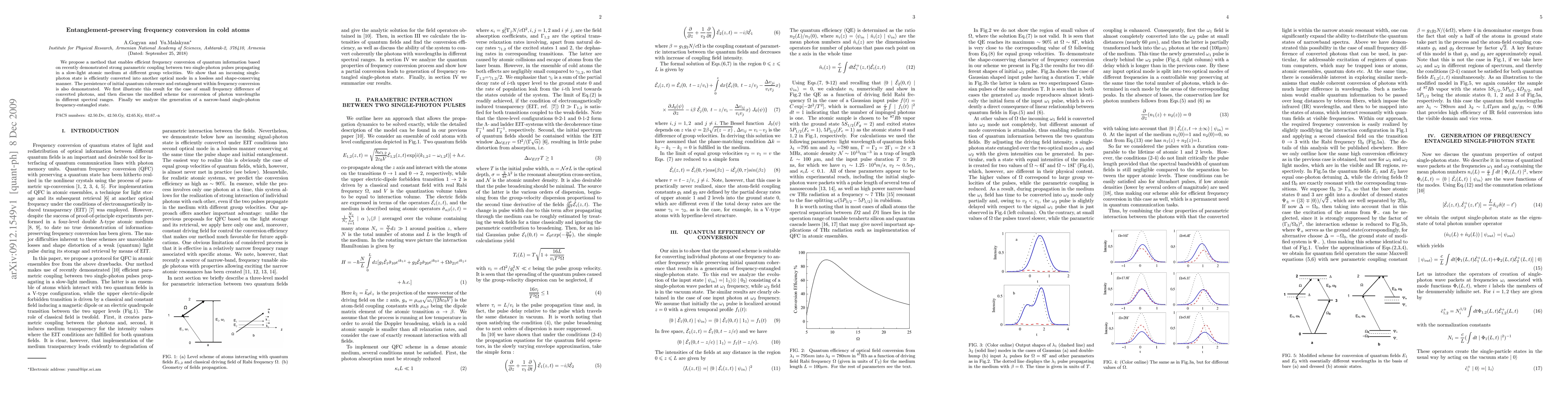 This paper proposes a method for efficient, lossless, and shape-conserving frequency conversion of quantum information in cold atoms, preserving quantum coherence and entanglement. The technique leverages strong parametric coupling between single-photon pulses in a slow-light atomic medium, demonstrating its application across different spectral ranges.