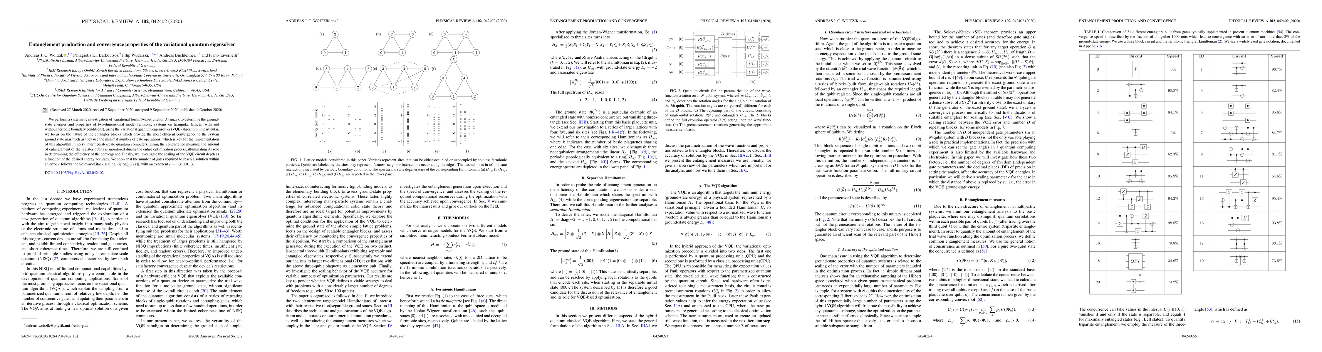 We perform a systematic investigation of variational forms (wave function Ans\"atze), to determine the ground state energies and properties of two-dimensional model fermionic systems on triangular lattices (with and without periodic boundary conditions), using the Variational Quantum Eigensolver (VQE) algorithm. In particular, we focus on the nature of the entangler blocks which provide the most efficient convergence to the system ground state inasmuch as they use the minimal number of gate operations, which is key for the implementation of this algorithm in NISQ computers. Using the concurrence measure, the amount of entanglement of the register qubits is monitored during the entire optimization process, illuminating its role in determining the efficiency of the convergence. Finally, we investigate the scaling of the VQE circuit depth as a function of the desired energy accuracy. We show that the number of gates required to reach a solution within an error $\varepsilon$ follows the Solovay-Kitaev scaling, $\mathcal{O}(\log^c(1/\varepsilon))$, with an exponent $c = 1.31 {\rm{\pm}}0.13$.