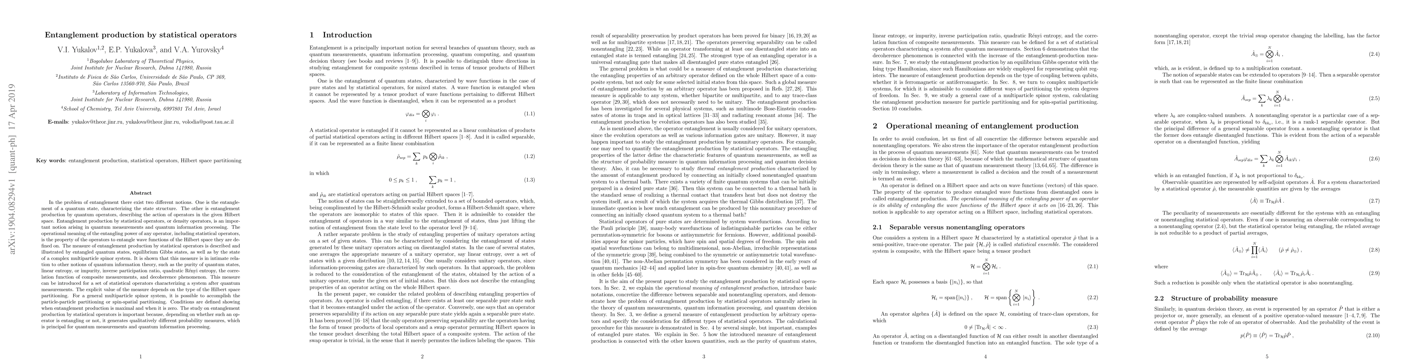 In the problem of entanglement there exist two different notions. One is the entanglement of a quantum state, characterizing the state structure. The other is entanglement production by quantum operators, describing the action of operators in the given Hilbert space. Entanglement production by statistical operators, or density operators, is an important notion arising in quantum measurements and quantum information processing. The operational meaning of the entangling power of any operator, including statistical operators, is the property of the operators to entangle wave functions of the Hilbert space they are defined on. The measure of entanglement production by statistical operators is described and illustrated by entangled quantum states, equilibrium Gibbs states, as well as by the state of a complex multiparticle spinor system. It is shown that this measure is in intimate relation to other notions of quantum information theory, such as the purity of quantum states, linear entropy, or impurity, inverse participation ratio, quadratic R\'{e}nyi entropy, the correlation function of composite measurements, and decoherence phenomenon. This measure can be introduced for a set of statistical operators characterizing a system after quantum measurements. The explicit value of the measure depends on the type of the Hilbert space partitioning. For a general multiparticle spinor system, it is possible to accomplish the particle-particle partitioning or spin-spatial partitioning. Conditions are defined showing when entanglement production is maximal and when it is zero. The study on entanglement production by statistical operators is important because, depending on whether such an operator is entangling or not, it generates qualitatively different probability measures, which is principal for quantum measurements and quantum information processing.