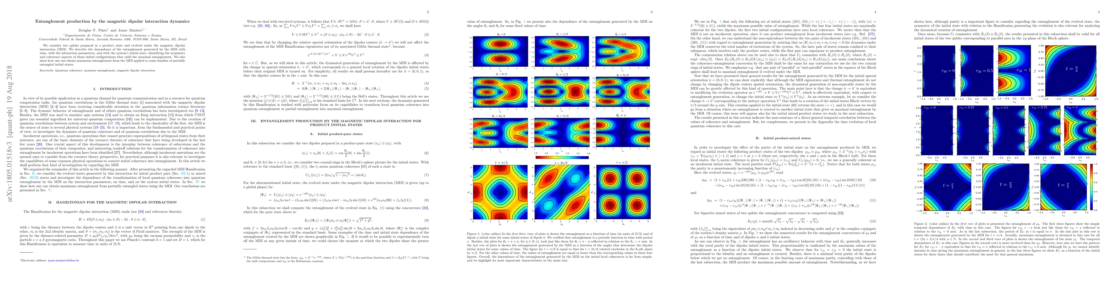 We consider two qubits prepared in a product state and evolved under the magnetic dipolar interaction (MDI). We describe the dependence of the entanglement generated by the MDI with time, with the interaction parameters, and with the system's initial state, identifying the symmetry and coherence aspects of those initial configurations that yield the maximal entanglement. We also show how one can obtain maximum entanglement from the MDI applied to some families of partially entangled initial states.