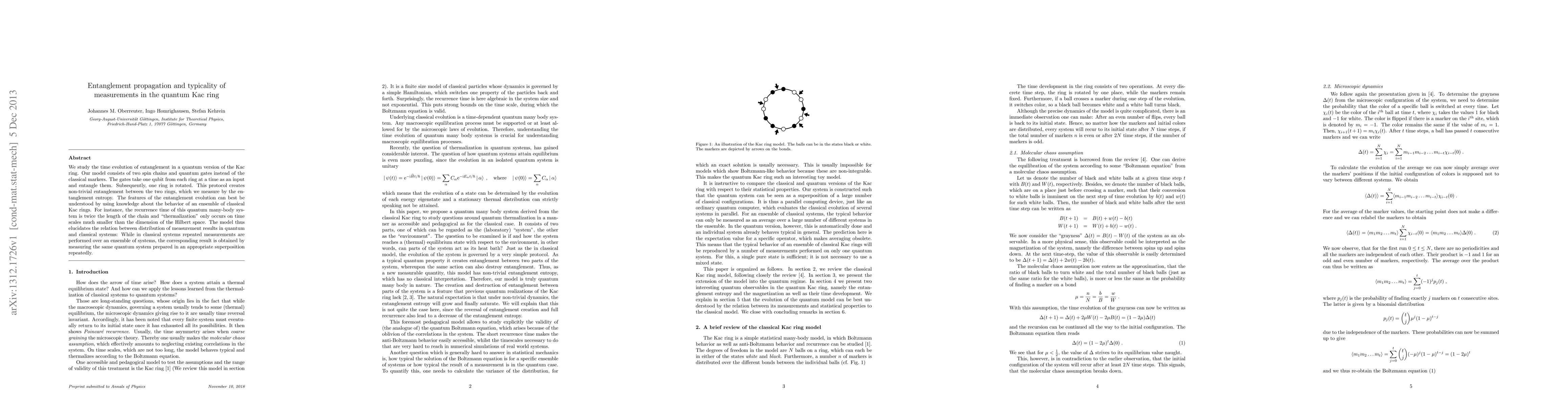 We study the time evolution of entanglement in a quantum version of the Kac ring. Our model consists of two spin chains and quantum gates instead of the classical markers. The gates take one qubit from each ring at a time as an input and entangle them. Subsequently, one ring is rotated. This protocol creates non-trivial entanglement between the two rings, which we measure by the entanglement entropy. The features of the entanglement evolution can best be understood by using knowledge about the behavior of an ensemble of classical Kac rings. For instance, the recurrence time of this quantum many-body system is twice the length of the chain and "thermalization" only occurs on time scales much smaller than the dimension of the Hilbert space. The model thus elucidates the relation between distribution of measurement results in quantum and classical systems: While in classical systems repeated measurements are performed over an ensemble of systems, the corresponding result is obtained by measuring the same quantum system prepared in an appropriate superposition repeatedly.