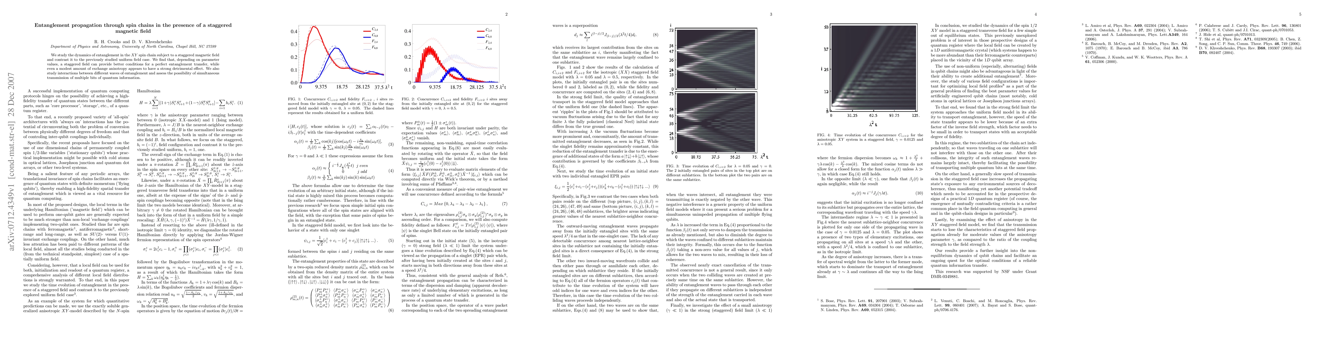 We study the dynamics of entanglement in the XY spin chain subject to a staggered magnetic field and contrast it to the previously studied uniform field case. We find that, depending on parameter values, a staggered field can provide better conditions for a perfect entanglement transfer, while even a modest amount of exchange anisotropy appears to have a strong detrimental effect. We also study interactions between different waves of entanglement and assess the possibility of simultaneous transmission of multiple bits of quantum information.