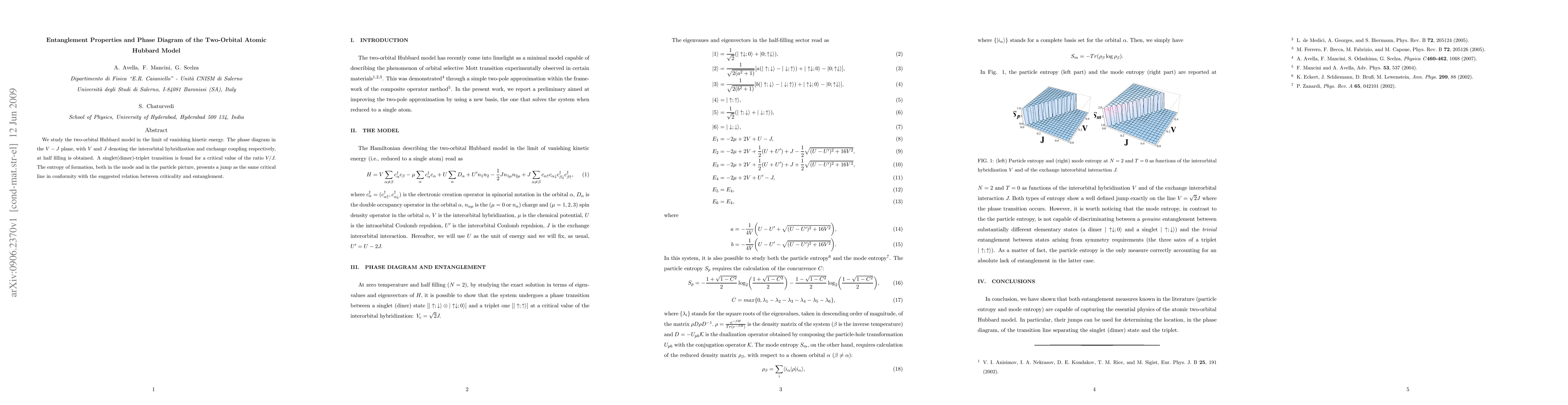 We study the two-orbital Hubbard model in the limit of vanishing kinetic energy. The phase diagram in the $V-J$ plane, with $V$ and $J$ denoting the interorbital hybridization and exchange coupling respectively, at half filling is obtained. A singlet(dimer)-triplet transition is found for a critical value of the ratio $V/J.$ The entropy of formation, both in the mode and in the particle picture, presents a jump as the same critical line in conformity with the suggested relation between criticality and entanglement.