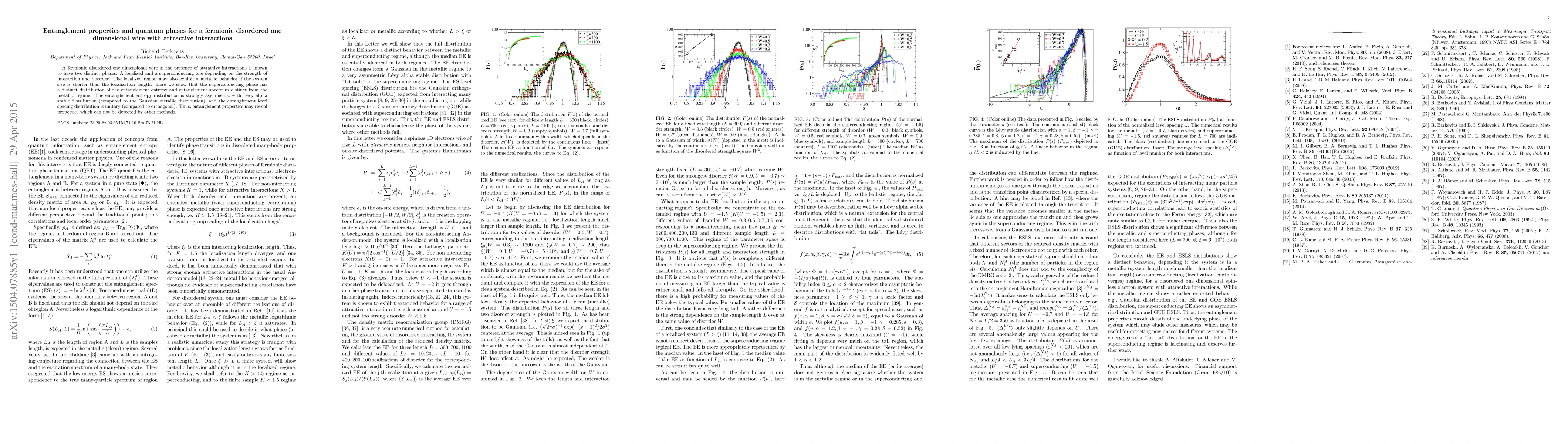 This paper investigates the entanglement properties in a fermionic disordered one-dimensional wire with attractive interactions, revealing distinct entanglement entropy and spectrum distributions between the superconducting and metallic phases. The superconducting phase exhibits a strongly asymmetric L\'evy alpha stable distribution, while the metallic phase shows a Gaussian distribution, highlighting entanglement as a unique probe of quantum phases.