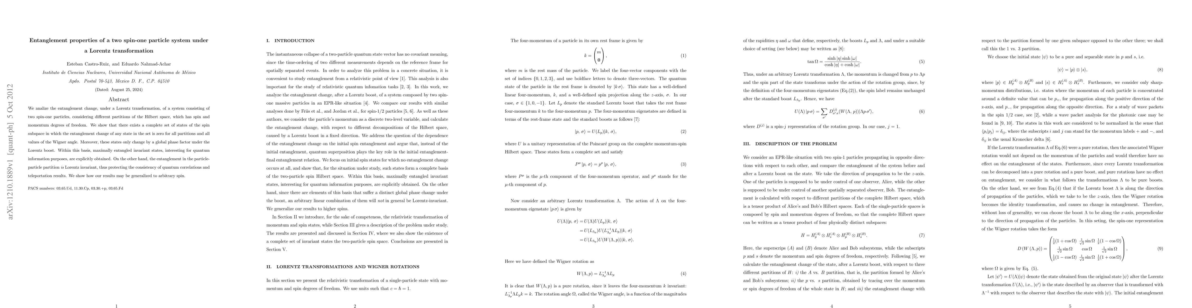 This paper investigates the entanglement properties of a two spin-one particle system under Lorentz transformations, revealing a set of maximally entangled states that remain invariant under such transformations. It demonstrates that entanglement in the particle-particle partition is Lorentz invariant, preserving quantum correlations and teleportation consistency.