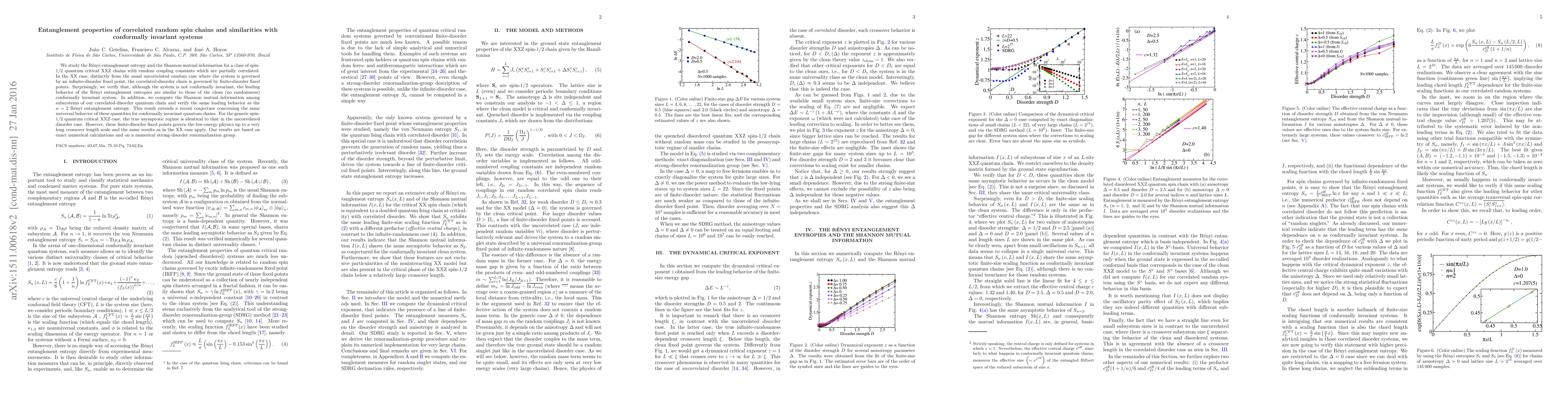 We study the R\'enyi entanglement entropy and the Shannon mutual information for a class of spin-1/2 quantum critical XXZ chains with random coupling constants which are partially correlated. In the XX case, distinctly from the usual uncorrelated random case where the system is governed by an infinite-disorder fixed point, the correlated-disorder chain is governed by finite-disorder fixed points. Surprisingly, we verify that, although the system is not conformally invariant, the leading behavior of the R\'enyi entanglement entropies are similar to those of the clean (no randomness) conformally invariant system. In addition, we compute the Shannon mutual information among subsystems of our correlated-disorder quantum chain and verify the same leading behavior as the $n=2$ R\'enyi entanglement entropy. This result extends a recent conjecture concerning the same universal behavior of these quantities for conformally invariant quantum chains. For the generic spin-1/2 quantum critical XXZ case, the true asymptotic regime is identical to that in the uncorrelated disorder case. However, these finite-disorder fixed points govern the low-energy physics up to a very long crossover length scale and the same results as in the XX case apply. Our results are based on exact numerical calculations and on a numerical strong-disorder renormalization group.