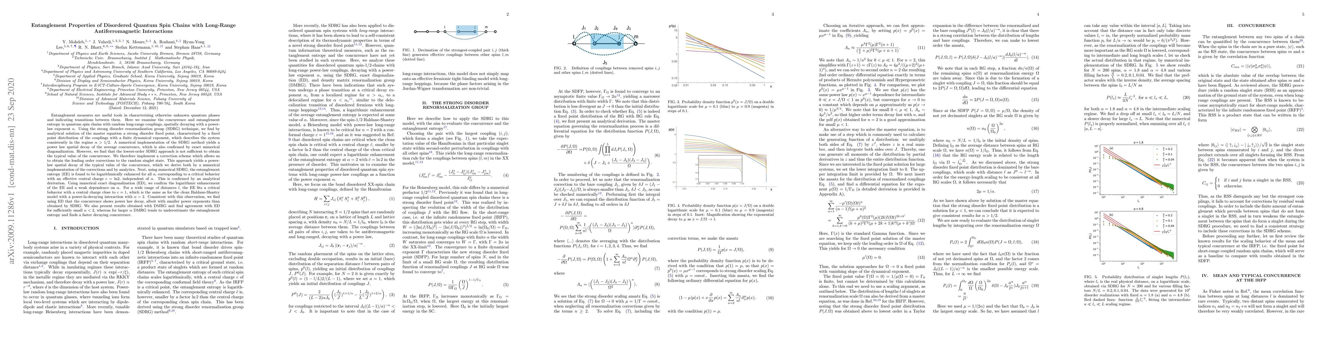 We examine the concurrence and entanglement entropy in quantum spin chains with random long-range couplings, spatially decaying with a power-law exponent $\alpha$. Using the strong disorder renormalization group (SDRG) technique, we find by analytical solution of the master equation a strong disorder fixed point, characterized by a fixed point distribution of the couplings with a finite dynamical exponent, which describes the system consistently in the regime $\alpha > 1/2$. A numerical implementation of the SDRG method yields a power law spatial decay of the average concurrence, which is also confirmed by exact numerical diagonalization. However, we find that the lowest-order SDRG approach is not sufficient to obtain the typical value of the concurrence. We therefore implement a correction scheme which allows us to obtain the leading order corrections to the random singlet state. This approach yields a power-law spatial decay of the typical value of the concurrence, which we derive both by a numerical implementation of the corrections and by analytics. Next, using numerical SDRG, the entanglement entropy (EE) is found to be logarithmically enhanced for all $\alpha$, corresponding to a critical behavior with an effective central charge $c = {\rm ln} 2$, independent of $\alpha$. This is confirmed by an analytical derivation. Using numerical exact diagonalization (ED), we confirm the logarithmic enhancement of the EE and a weak dependence on $\alpha$. For a wide range of distances $l$, the EE fits a critical behavior with a central charge close to $c=1$, which is the same as for the clean Haldane-Shastry model with a power-la-decaying interaction with $\alpha =2$. Consistent with this observation, we find using ED that the concurrence shows power law decay, albeit with smaller power exponents than obtained by SDRG.