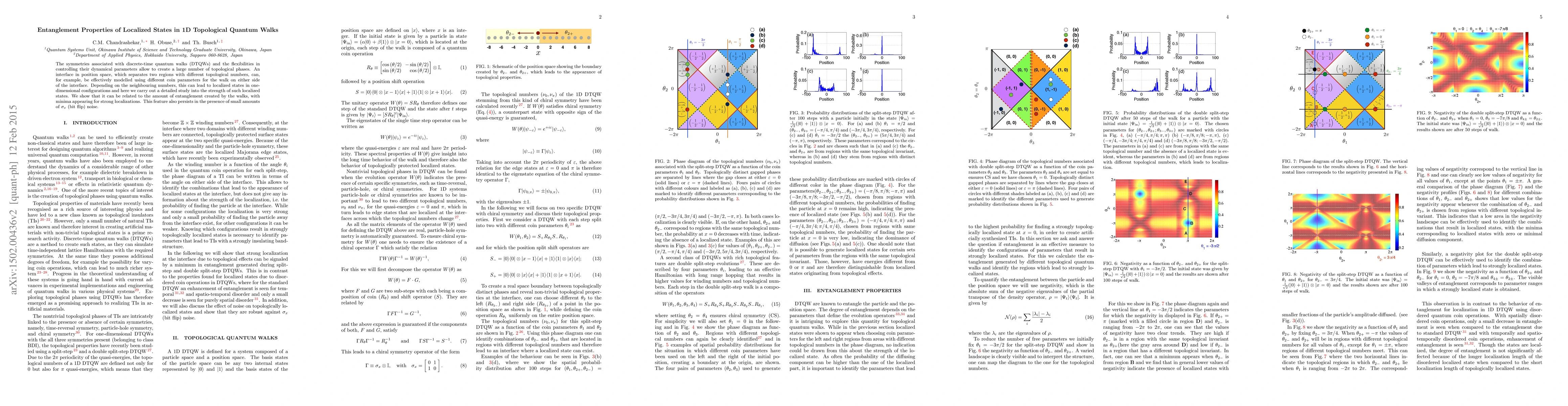The symmetries associated with discrete-time quantum walks (DTQWs) and the flexibilities in controlling their dynamical parameters allow to create a large number of topological phases. An interface in position space, which separates two regions with different topological numbers, can, for example, be effectively modelled using different coin parameters for the walk on either side of the interface. Depending on the neighbouring numbers, this can lead to localized states in one-dimensional configurations and here we carry out a detailed study into the strength of such localized states. We show that it can be related to the amount of entanglement created by the walks, with minima appearing for strong localizations. This feature also persists in the presence of small amounts of $\sigma_x$ (bit flip) noise.