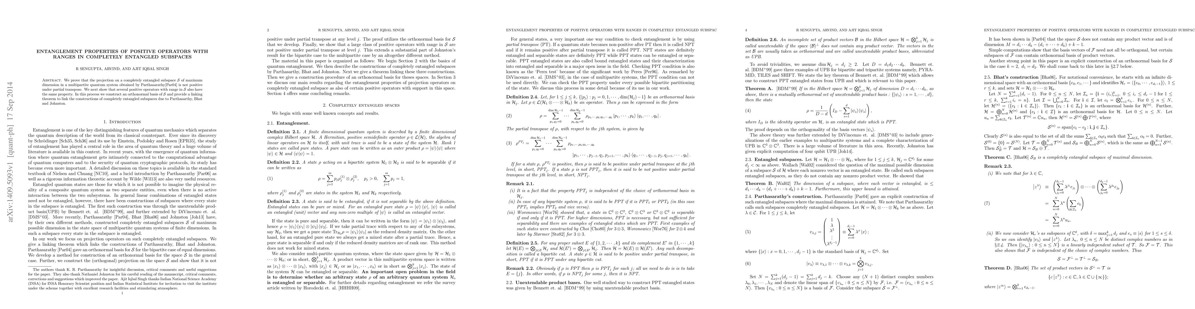 We prove that the projection on a completely entangled subspace S of maximum dimension in a multipartite quantum system obtained by Parthasarathy is not positive under partial transpose. We next show that several positive operators with range in S also have the same property. In this process we construct an orthonormal basis of S and provide a linking theorem to link the constructions of completely entangled subspaces due to Parthasarthy, Bhat and Johnston.