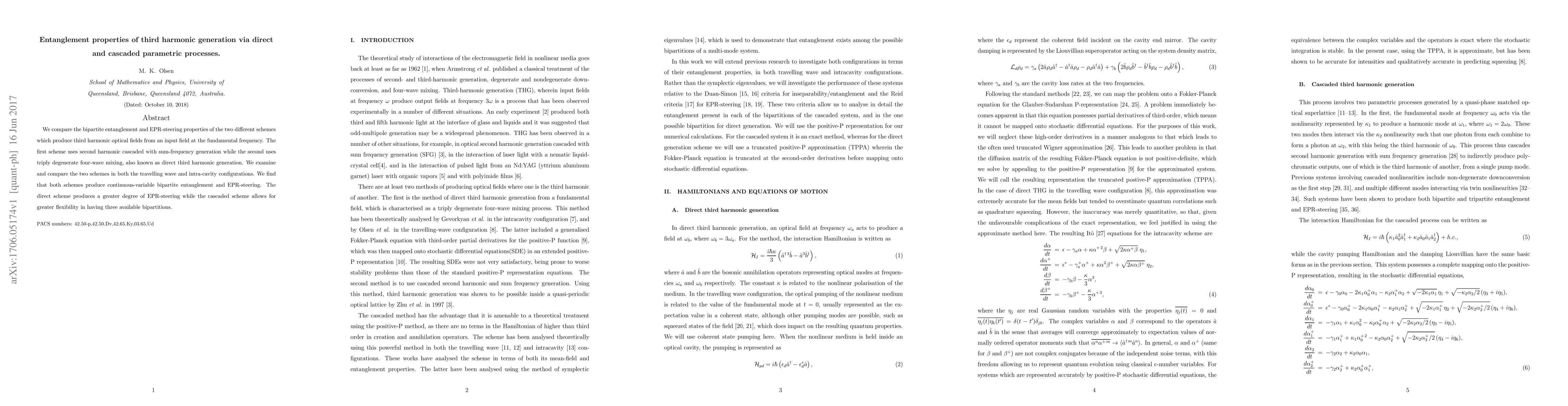 This paper compares the entanglement and EPR-steering properties of two methods for generating third harmonic optical fields: cascaded parametric processes and direct third harmonic generation. Both schemes produce continuous-variable bipartite entanglement and EPR-steering, with the direct method exhibiting stronger EPR-steering and the cascaded method offering more flexibility through three available bipartitions.