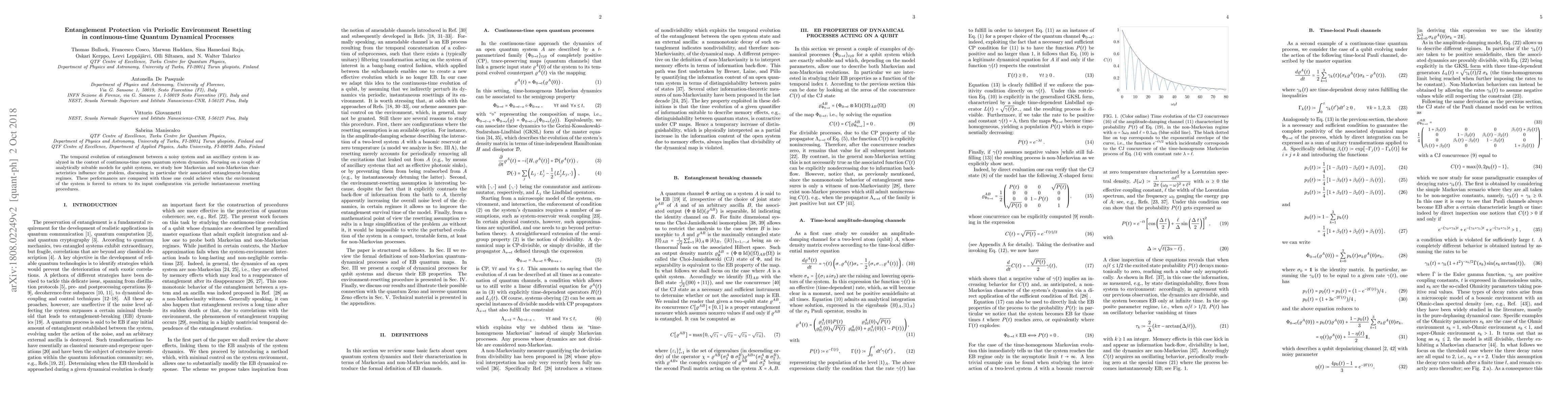 This paper investigates how entanglement between a noisy quantum system and an ancillary system evolves over time, comparing Markovian and non-Markovian dynamics. It also explores the effect of periodic environment resetting on entanglement protection in continuous time quantum dynamical processes.