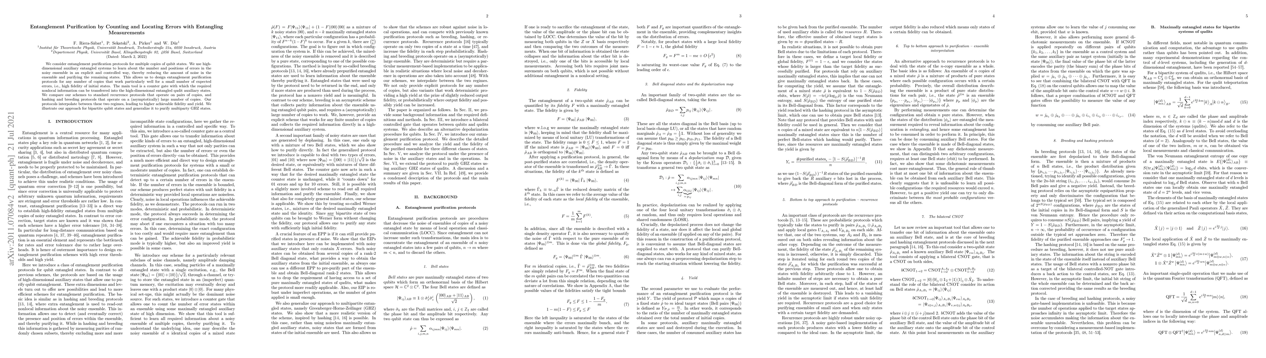 We consider entanglement purification protocols for multiple copies of qubit states. We use high-dimensional auxiliary entangled systems to learn about number and positions of errors in the noisy ensemble in an explicit and controlled way, thereby reducing the amount of noise in the ensemble and purifying the remaining states. This allows us to design entanglement purification protocols for any number of copies that work particularly well for a small number of expected errors, i.e. high fidelity of initial states. The main tool is a counter gate with which the required non-local information can be transferred into the high-dimensional entangled qudit auxiliary states. We compare our schemes to standard recurrence protocols that operate on pairs of copies, and hashing and breeding protocols that operate on a (asymptotically) large number of copies. Our protocols interpolate between these two regimes, leading to a higher achievable fidelity and yield. We illustrate our approach for bipartite qubit states, and generalize it to purify multi-party GHZ states.