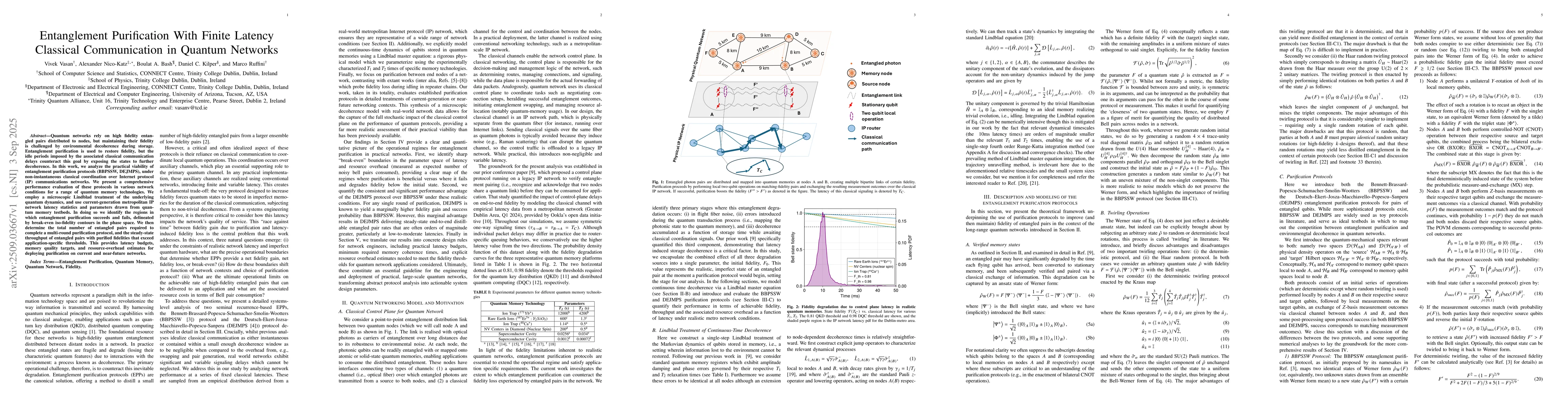 Quantum networks rely on high fidelity entangled pairs distributed to nodes, but maintaining their fidelity is challenged by environmental decoherence during storage. Entanglement purification is used to restore fidelity, but the idle periods imposed by the associated classical communication delays counteract this goal by exposing the states to further decoherence. In this work, we analyze the practical viability of entanglement purification protocols (BBPSSW, DEJMPS), under non-instantaneous classical coordination over Internet protocol (IP) communications networks. We present a comprehensive performance evaluation of these protocols in various network conditions for a range of quantum memory technologies. We employ a microscopic Lindblad treatment of the underlying quantum dynamics, and use current-generation metropolitan IP network latency statistics and parameters drawn from quantum memory testbeds. In doing so we identify the regions in which entanglement purification succeeds and fails, delineated by break-even iso-fidelity contours in the phase space. We then determine the total number of entangled pairs required to complete a multi-round purification protocol, and the steady-state throughput of entangled pairs with purified fidelities that exceed application-specific thresholds. This provides latency budgets, memory quality targets, and resource-overhead estimates for deploying purification on current and near-future networks.