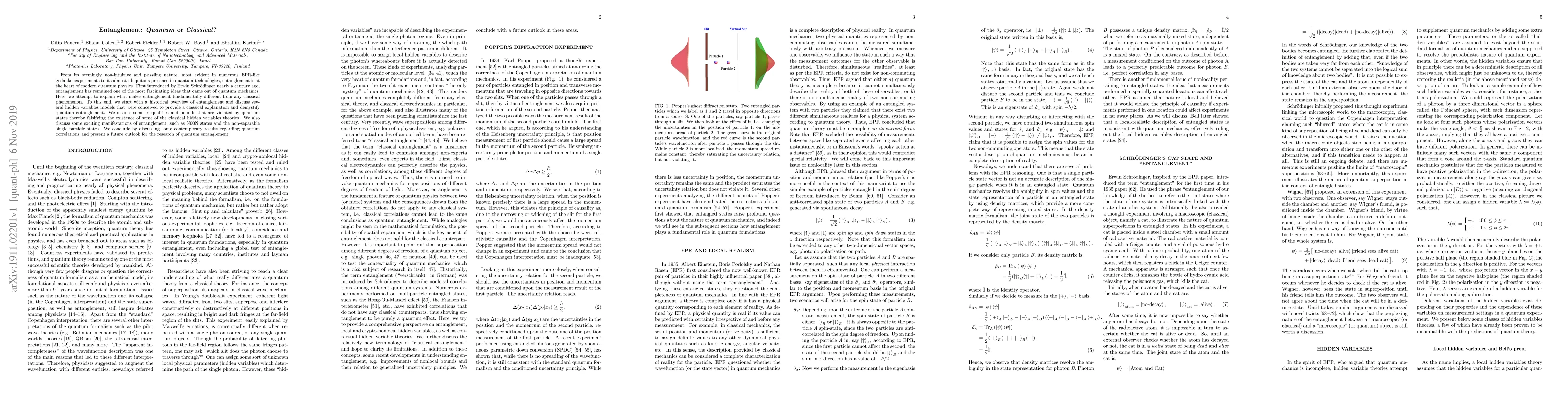 From its seemingly non-intuitive and puzzling nature, most evident in numerous EPR-like gedankenexperiments to its almost ubiquitous presence in quantum technologies, entanglement is at the heart of modern quantum physics. First introduced by Erwin Schr\"{o}dinger nearly a century ago, entanglement has remained one of the most fascinating ideas that came out of quantum mechanics. Here, we attempt to explain what makes entanglement fundamentally different from any classical phenomenon. To this end, we start with a historical overview of entanglement and discuss several hidden variables models that were conceived to provide a classical explanation and demystify quantum entanglement. We discuss some inequalities and bounds that are violated by quantum states thereby falsifying the existence of some of the classical hidden variables theories. We also discuss some exciting manifestations of entanglement, such as N00N states and the non-separable single particle states. We conclude by discussing some contemporary results regarding quantum correlations and present a future outlook for the research of quantum entanglement.
