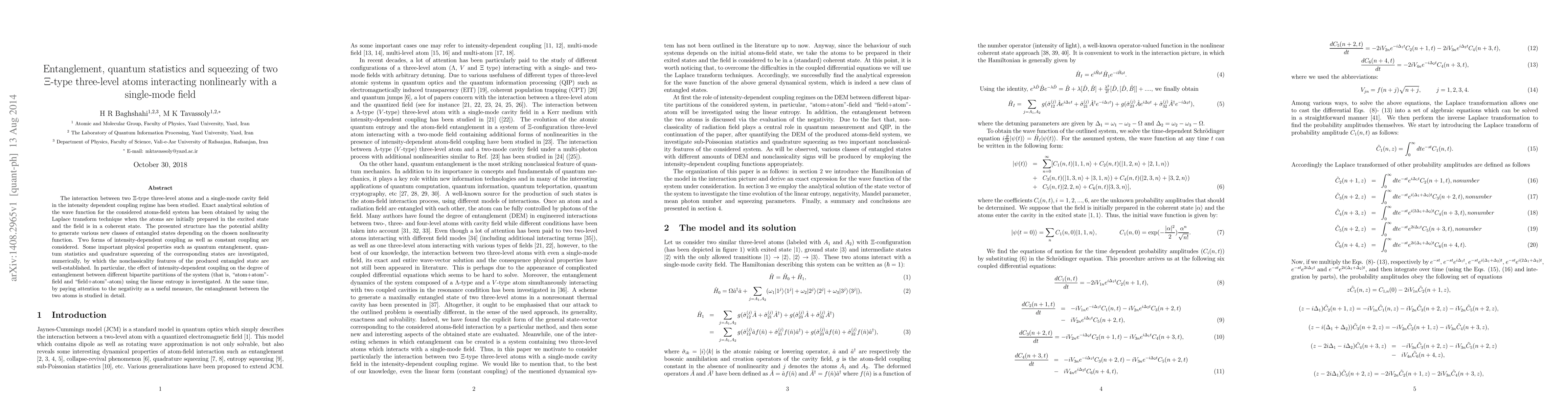 This paper studies the entanglement, quantum statistics, and squeezing properties of two $\Xi$-type three-level atoms interacting nonlinearly with a single-mode cavity field. Exact analytical solutions are obtained to explore various entangled states generated by different coupling regimes, and numerical analysis establishes their nonclassical features.
