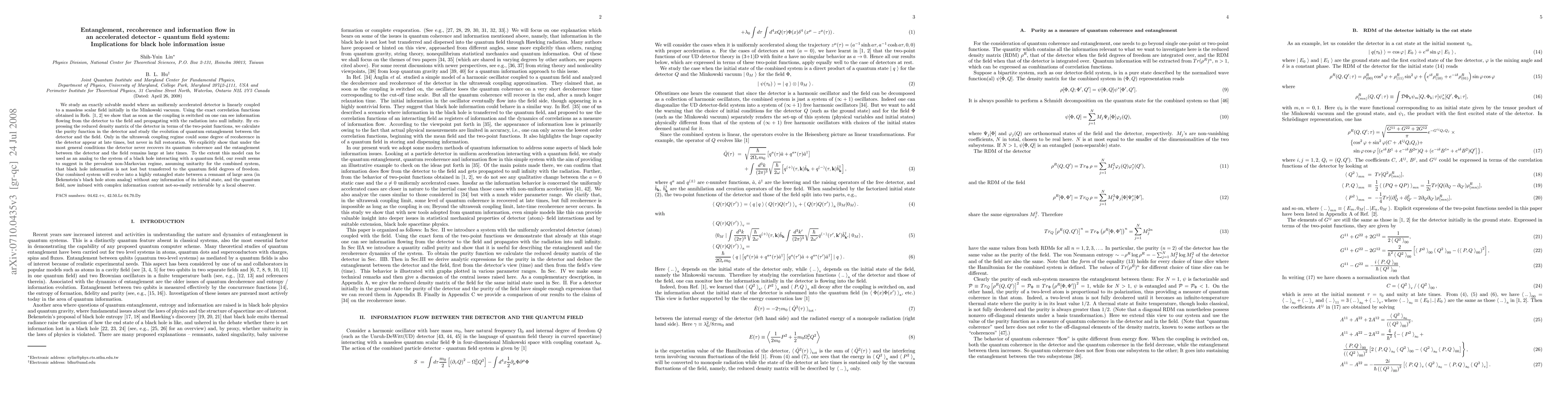 This paper investigates an accelerated detector interacting with a massless scalar field, demonstrating that information flows from the detector to the field and propagates with radiation. The study finds that while some recoherence may occur in ultraweak coupling, full restoration is impossible, and entanglement remains significant. The findings suggest that black hole information may be transferred to quantum field degrees of freedom, implying information preservation in a highly entangled state.
