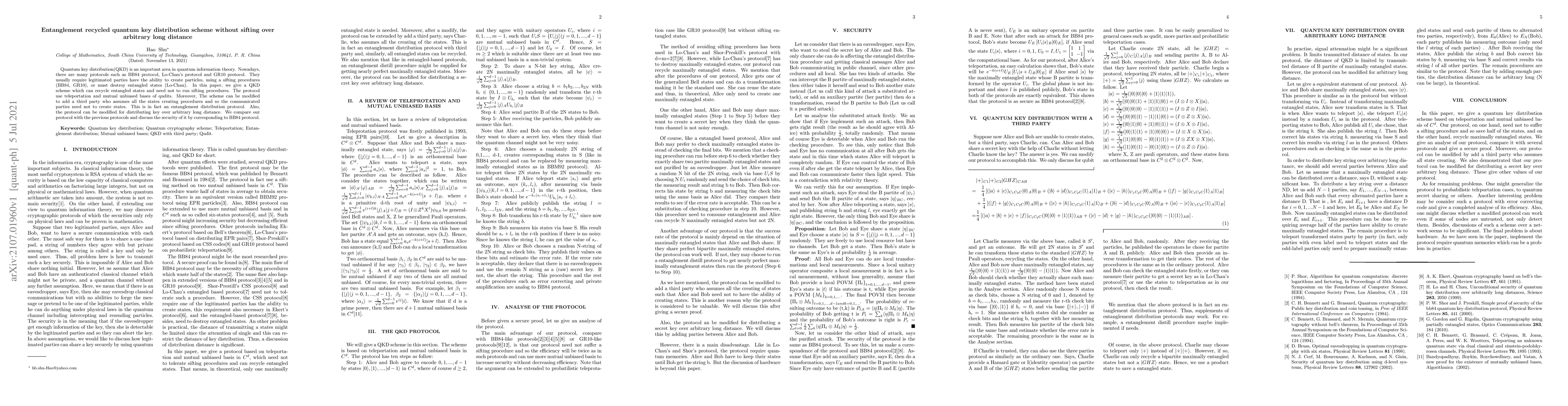 This paper proposes a novel quantum key distribution (QKD) scheme that recycles entangled states without requiring sifting procedures, using teleportation and mutual unbiased bases. It can also involve a third party to create states, allowing for long-distance key distribution and comparing its security to the BB84 protocol.